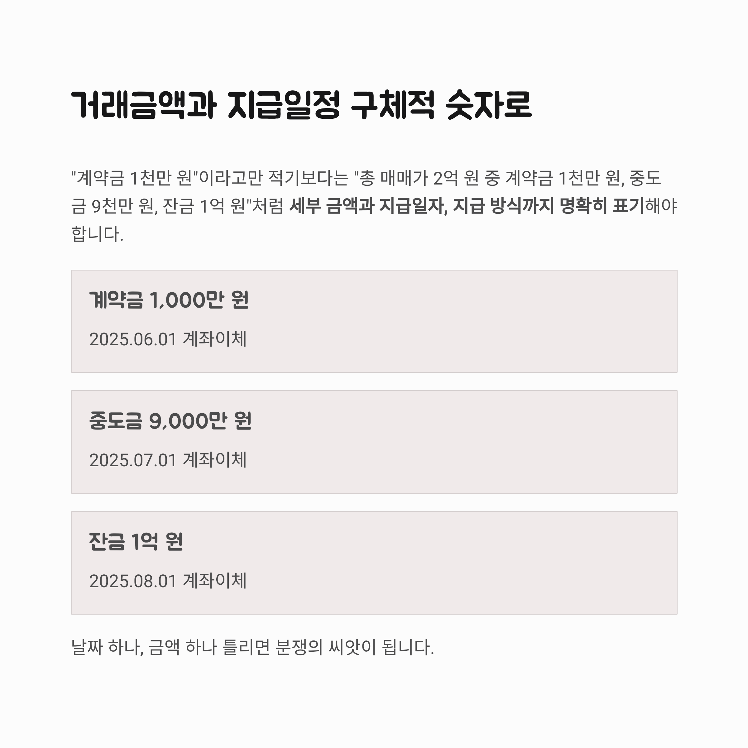 세부 금액과 지급일자, 지급 방식까지 명확히 표기해야 합니다.