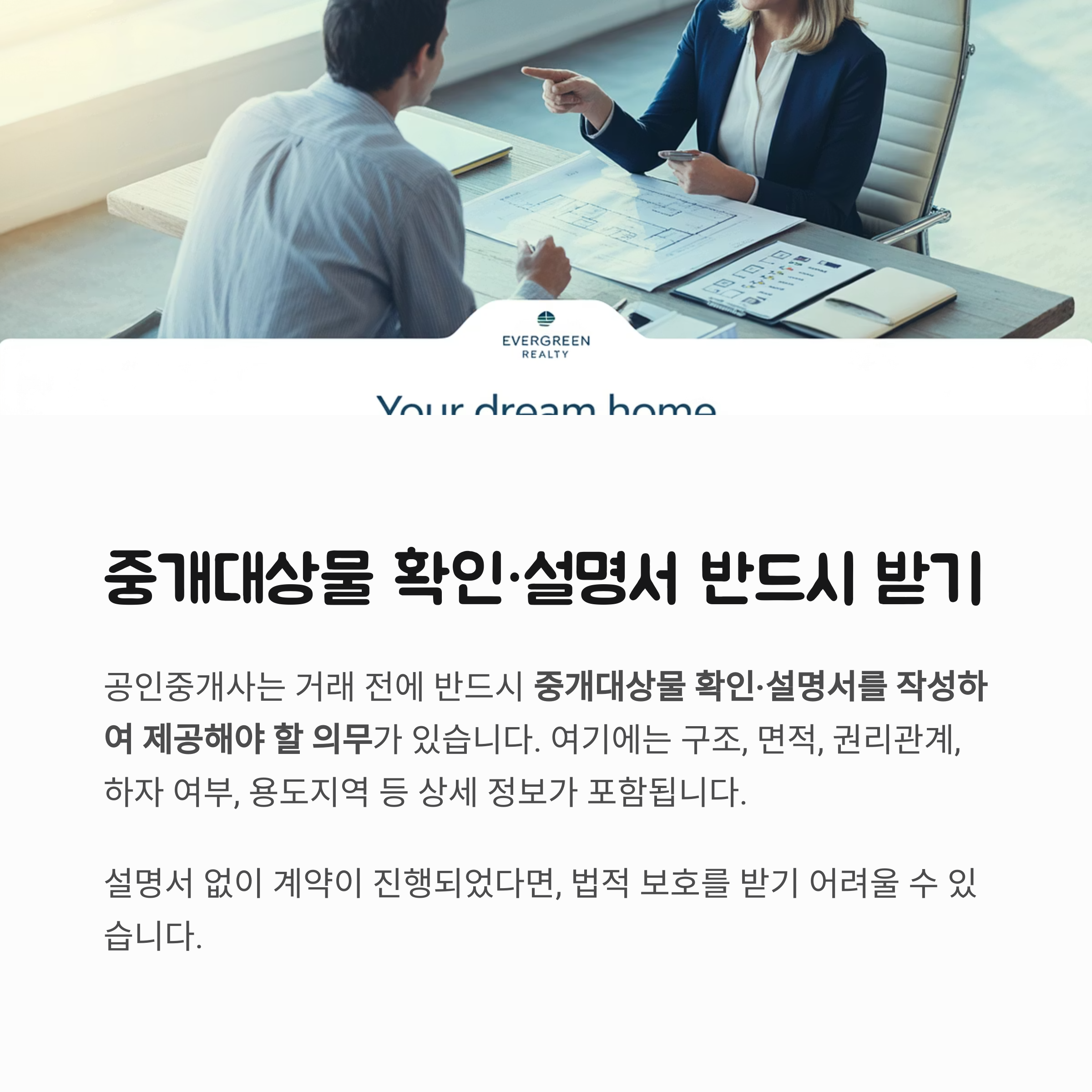 공인중개사는 거래 전에 반드시 중개대상물 확인·설명서를 작성하여 제공해야 할 의무가 있습니다.