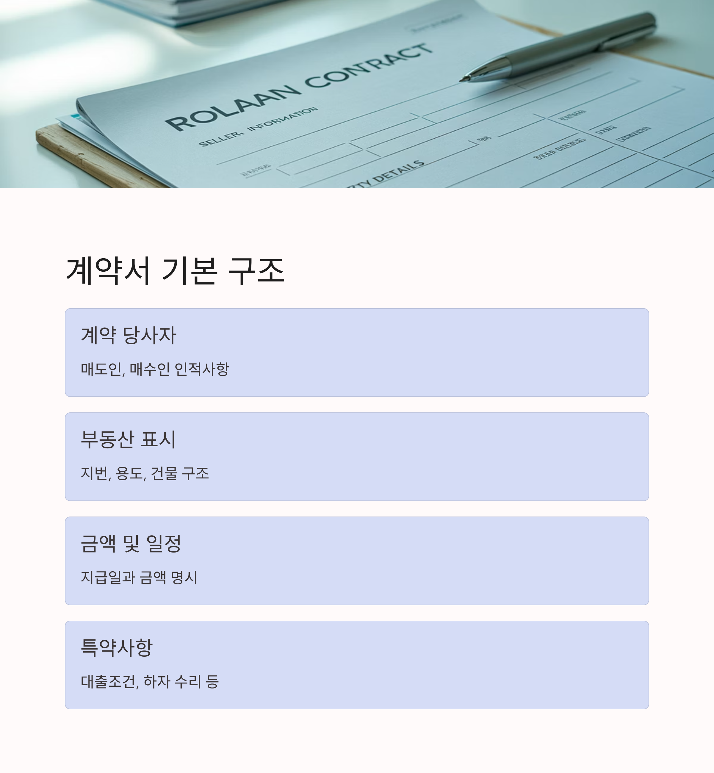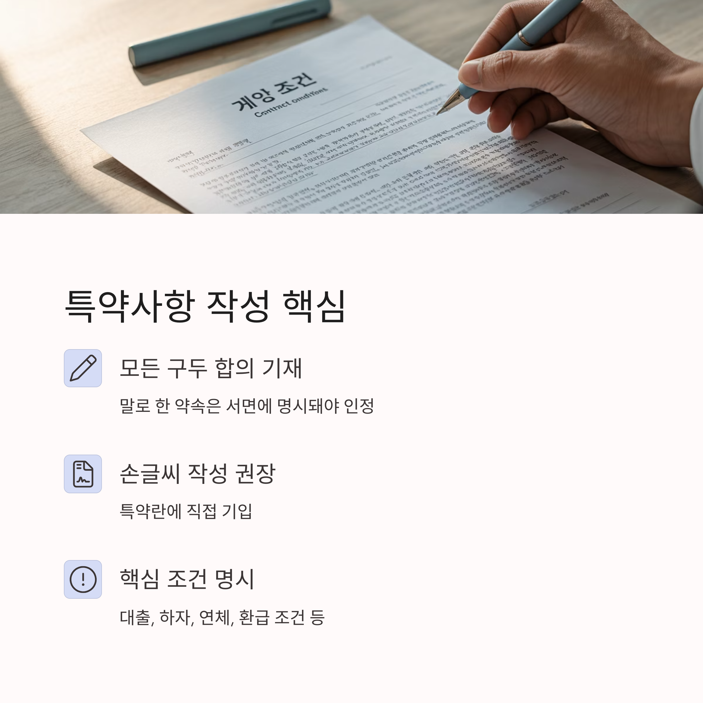 | 특약사항 | 대출조건, 하자 수리, 세금 부담 등 |