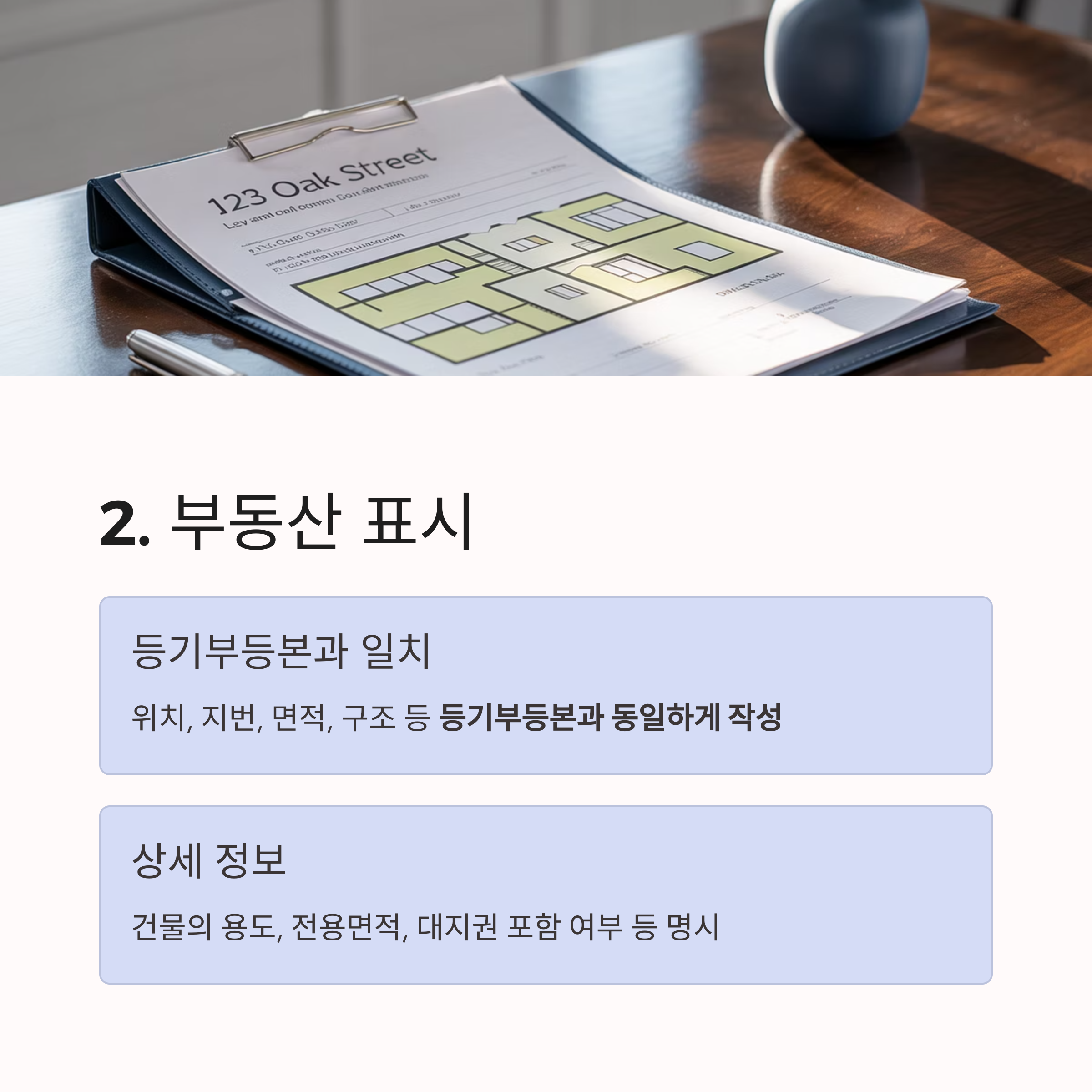 2. 부동산 표시: 정확한 지번과 구조 기재