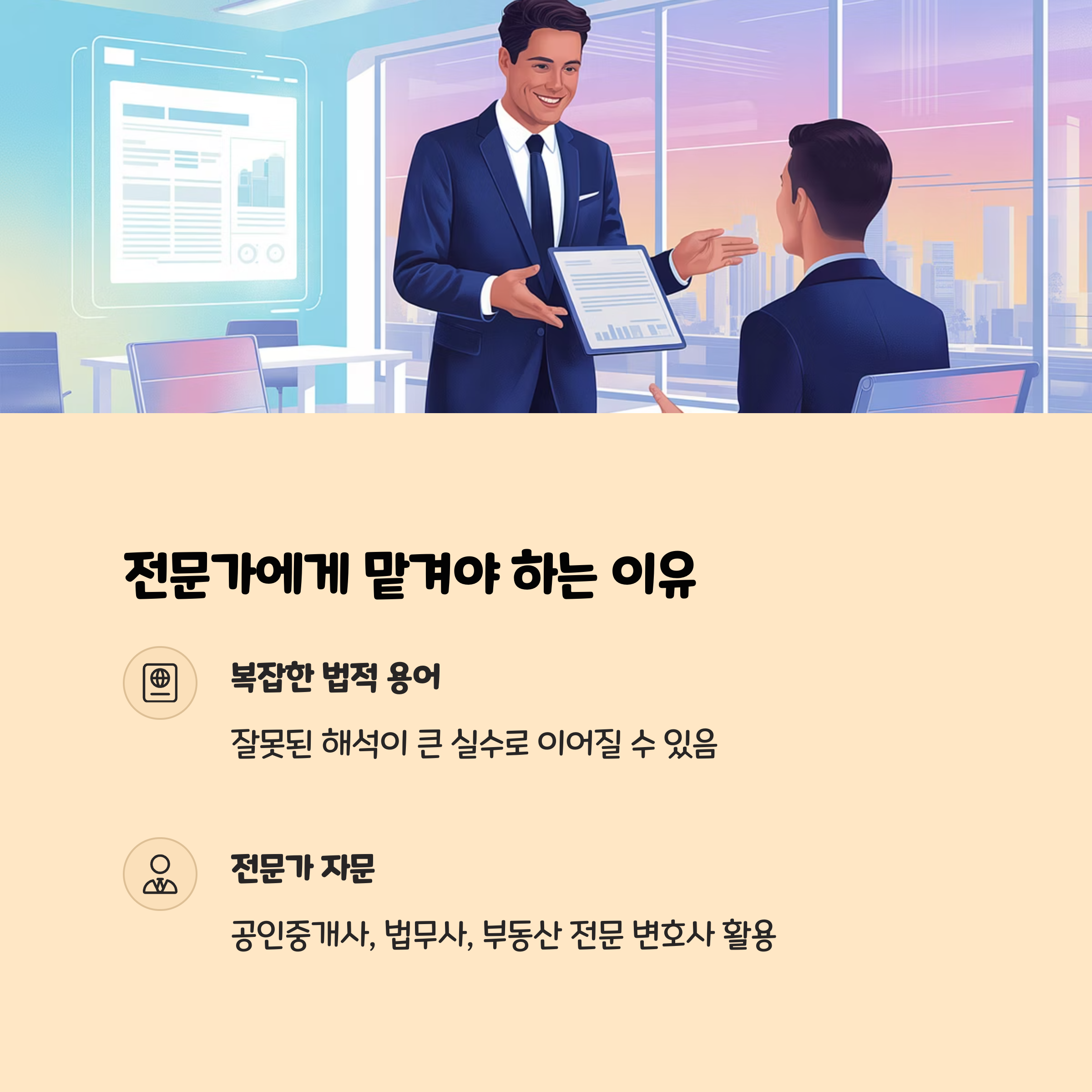 따라서 가능하다면 공인중개사, 법무사, 부동산 전문 변호사 등의 자문을 받는 것이 좋습니다.