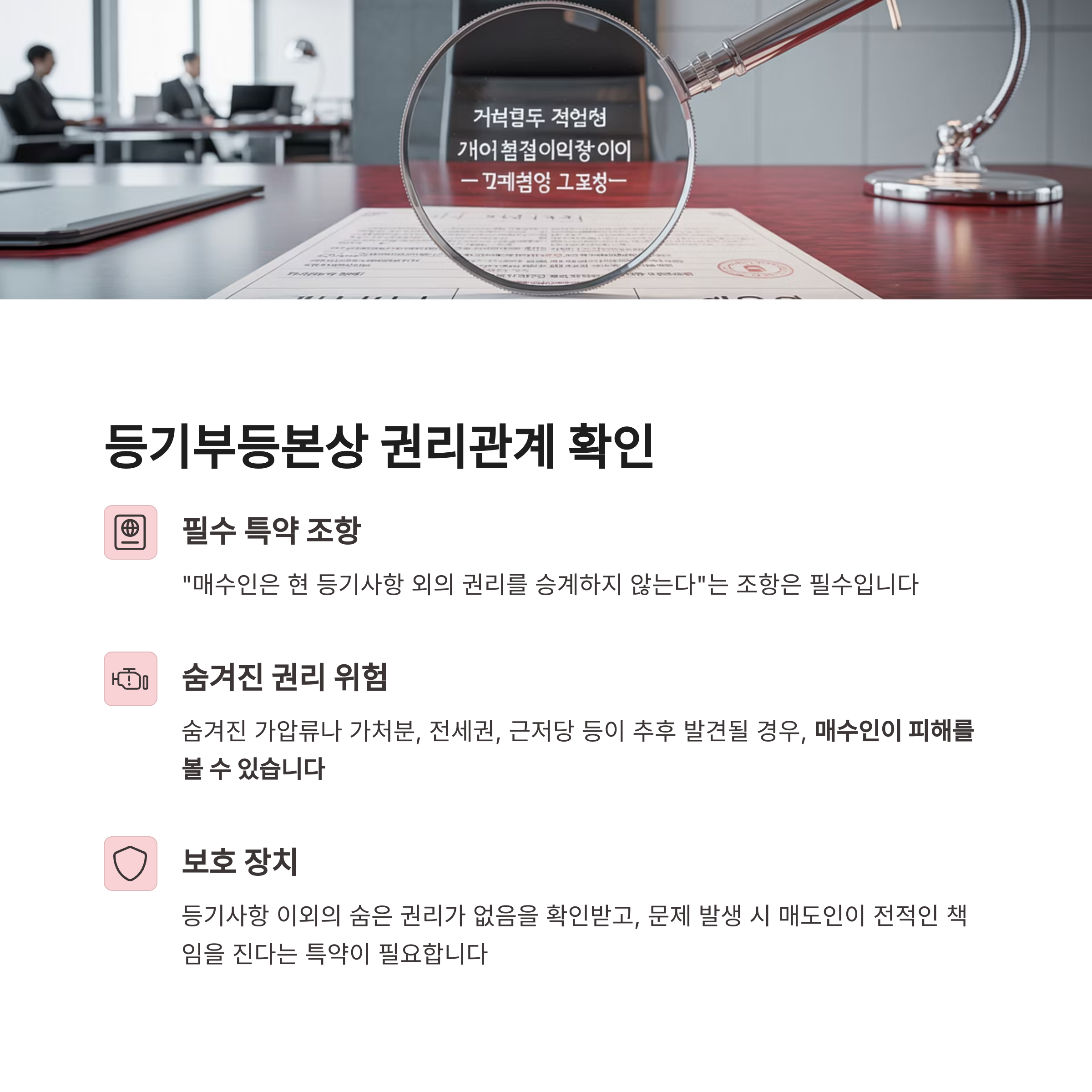 등기사항 이외의 숨은 권리가 없음을 확인받고, 문제가 발생할 경우 매도인이 전적인 책임을 진다는 특약이 필요합니다.