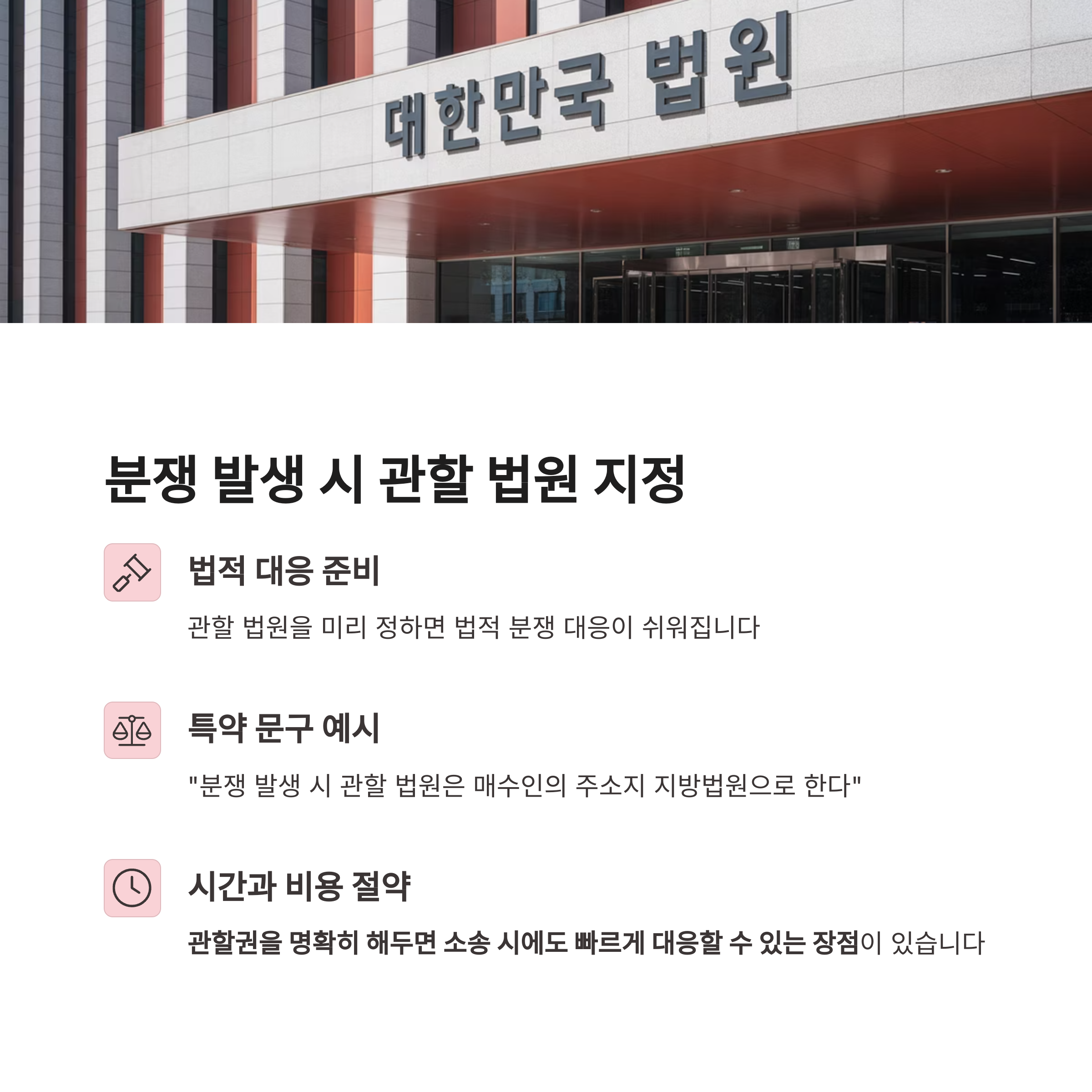 "분쟁 발생 시 관할 법원은 매수인의 주소지 지방법원으로 한다"는 식으로