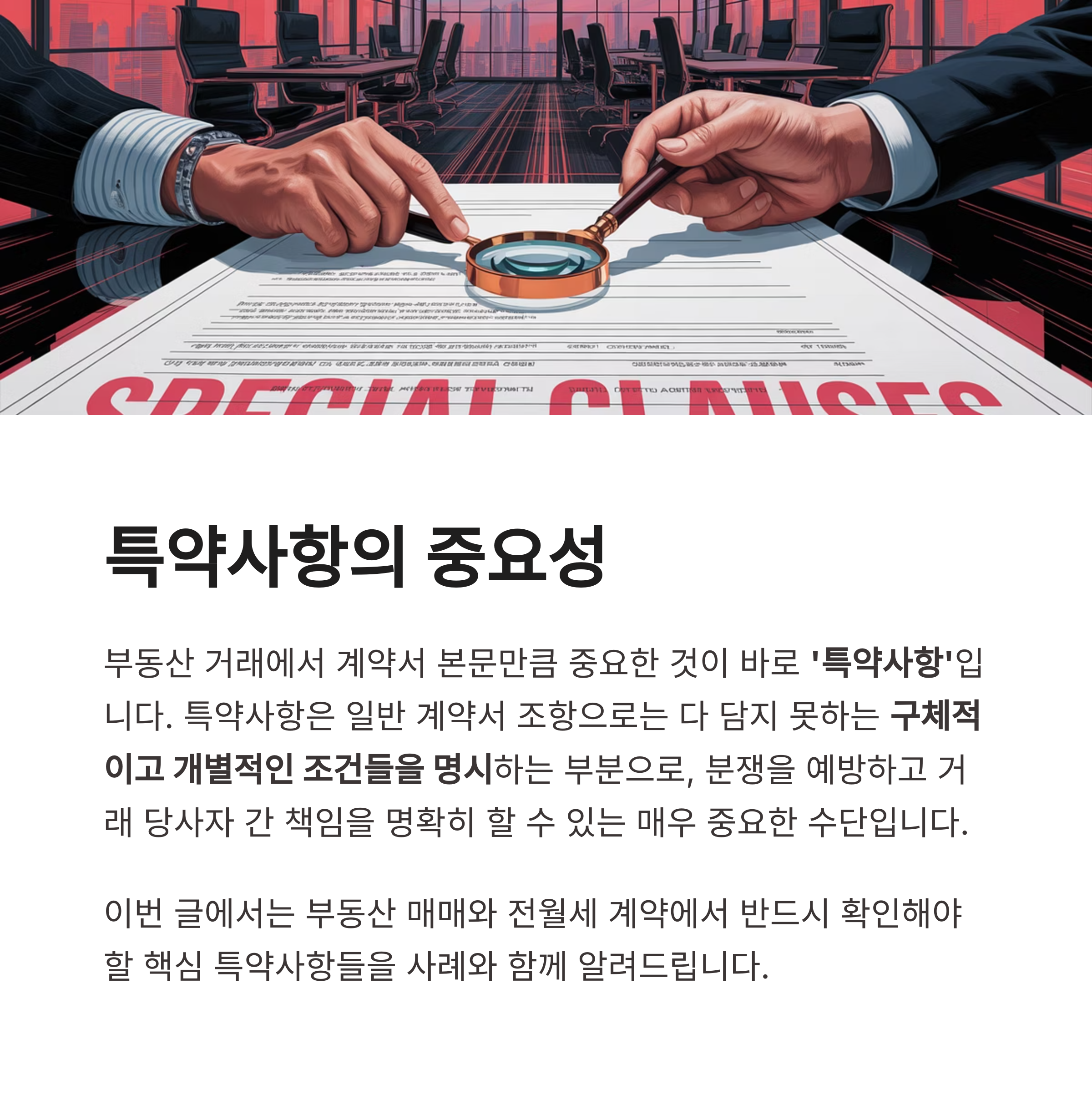 이번 글에서는 부동산 매매와 전월세 계약에서 반드시 확인해야 할 핵심 특약사항들을 사례와 함께 알려드립니다.