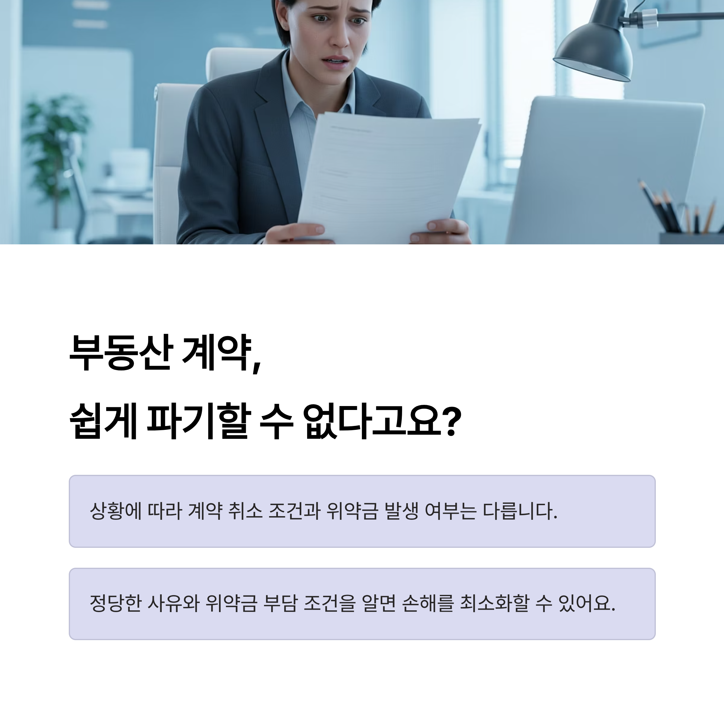 부동산 계약은 보통 큰 금액이 오가는 중요한 약속이기 때문에, 한 번 체결하면 쉽게 파기할 수 없다고 생각하시는 분들이 많습니다. 하지만 상황에 따라 계약을 취소할 수 있는 조건과, 그에 따른 위약금 발생 여부는 다릅니다. 이 글에서는 부동산 계약을 취소할 수 있는 정당한 사유와 위약금 부담 조건을 자세히 알려드립니다. 분쟁을 막고, 손해를 최소화하는 방법까지 꼭 확인해보세요.