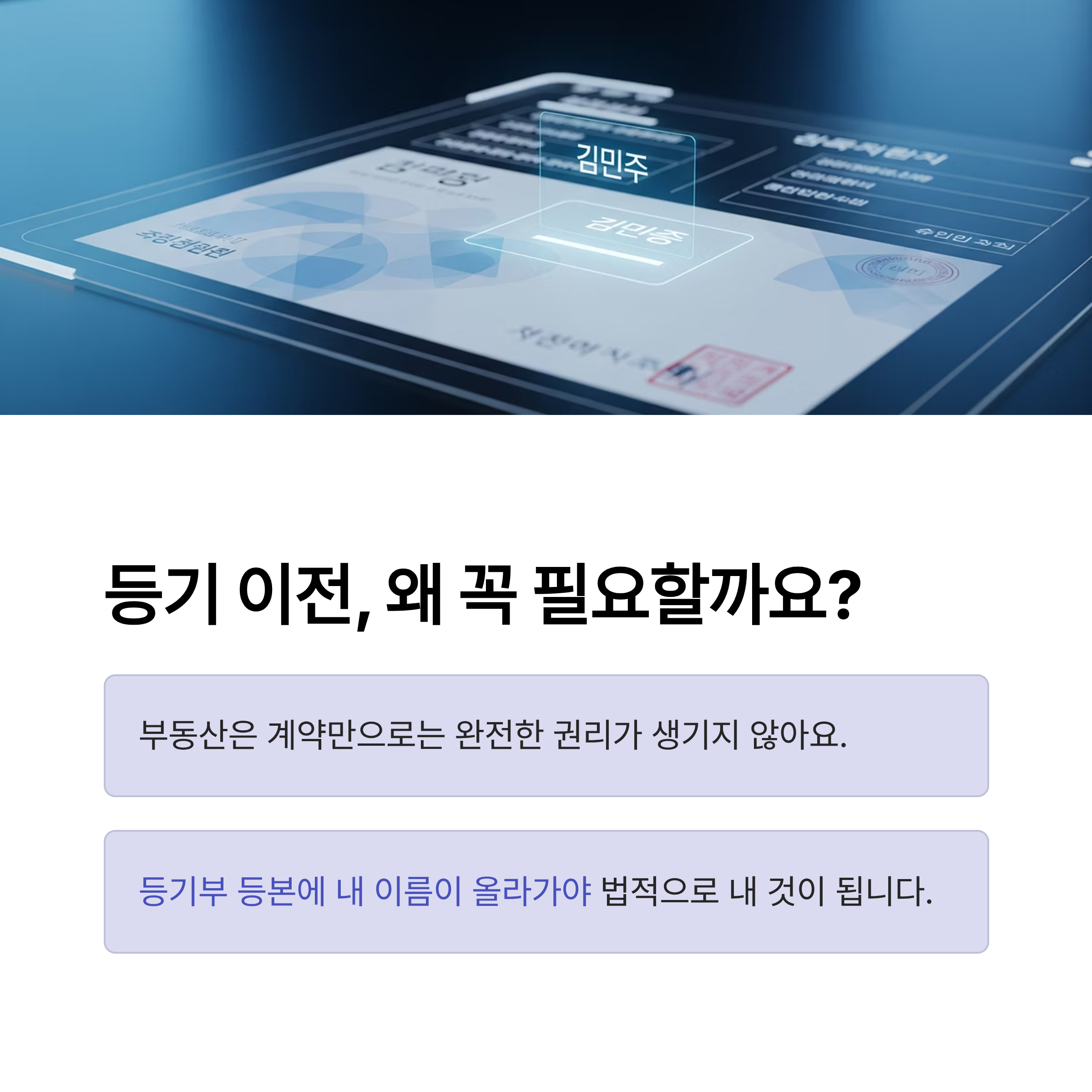 부동산은 계약만으로는 완전한 권리가 생기지 않아요.
