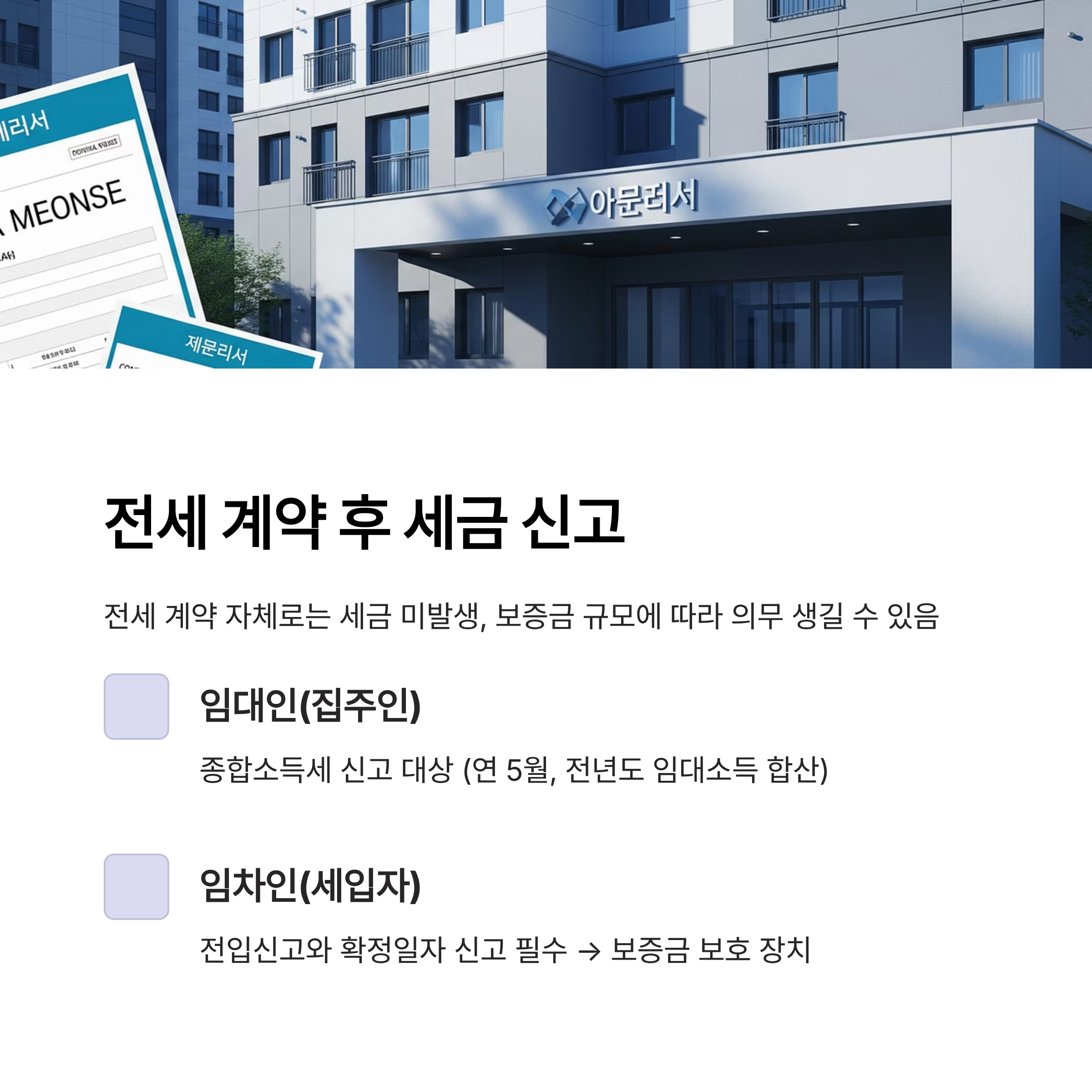 • 임대인(집주인): 종합소득세 신고 대상 (연 5월, 전년도 임대소득 합산)