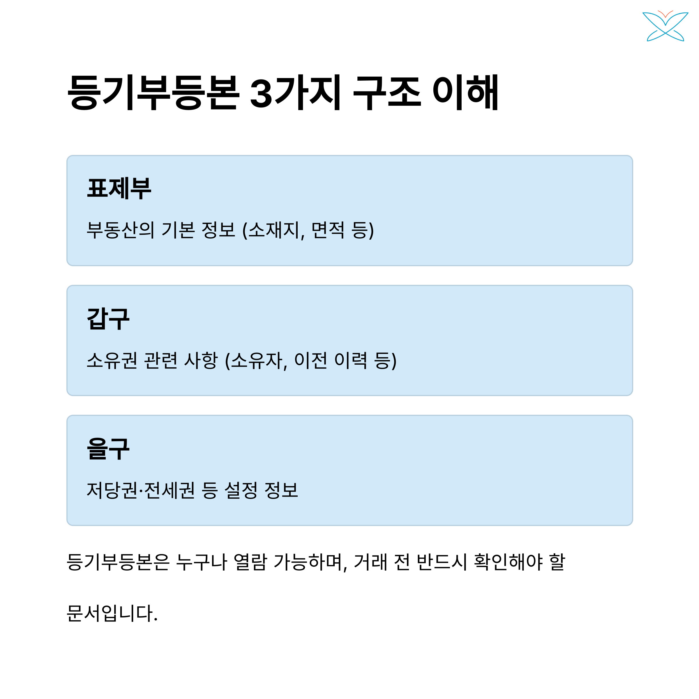 부동산 등기부등본은 크게 세 부분으로 나뉘어 있습니다.