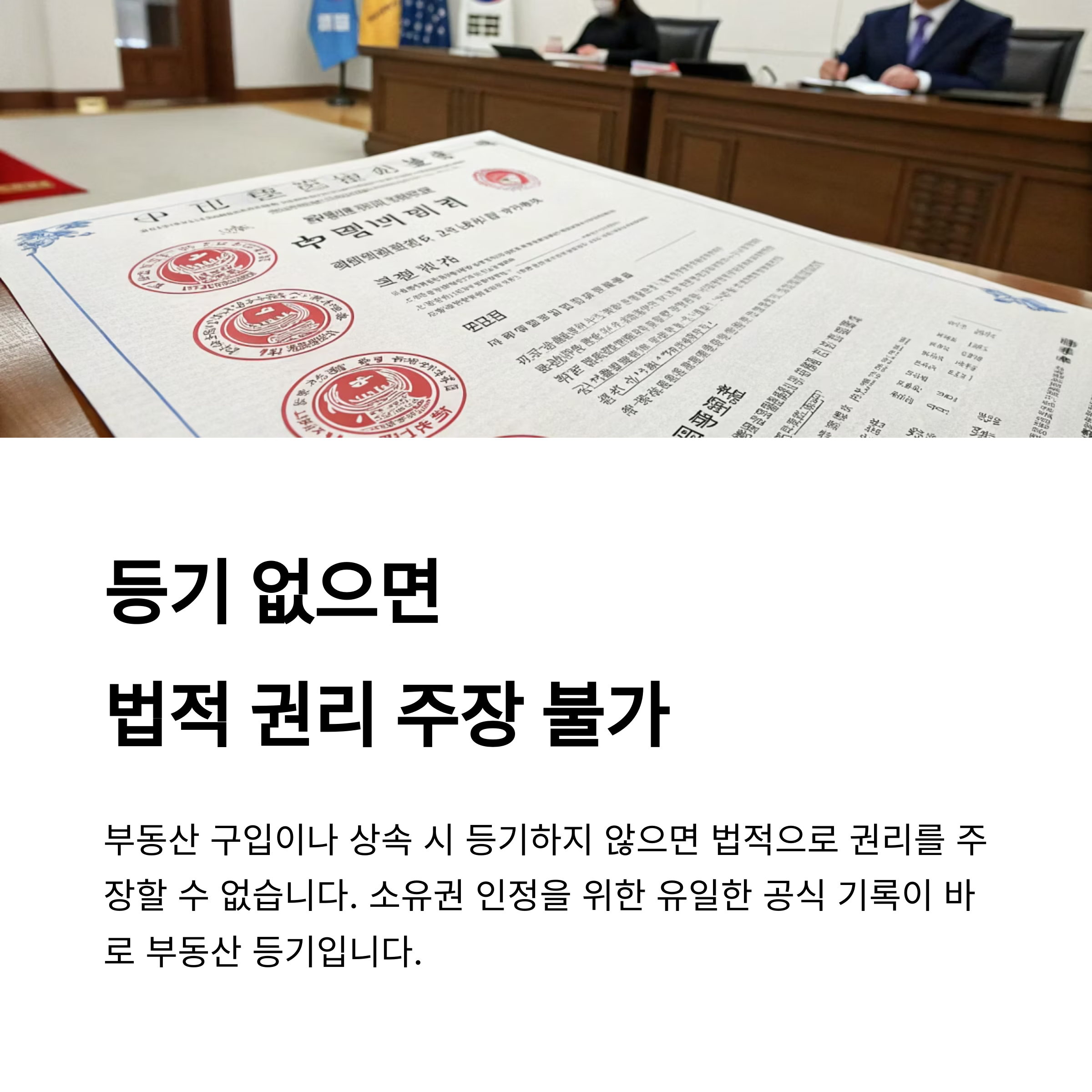 부동산을 구입하거나 상속받을 때 등기를 하지 않으면, 법적으로 권리를 주장할 수 없습니다.
