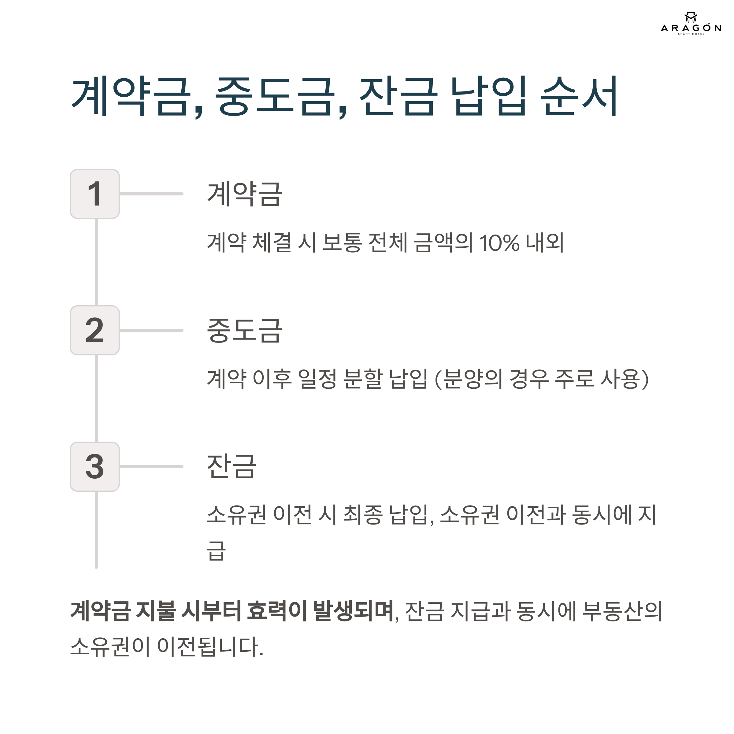 | 잔금 | 소유권 이전 시 | 최종 납입, 소유권 이전과 동시에 지급 |