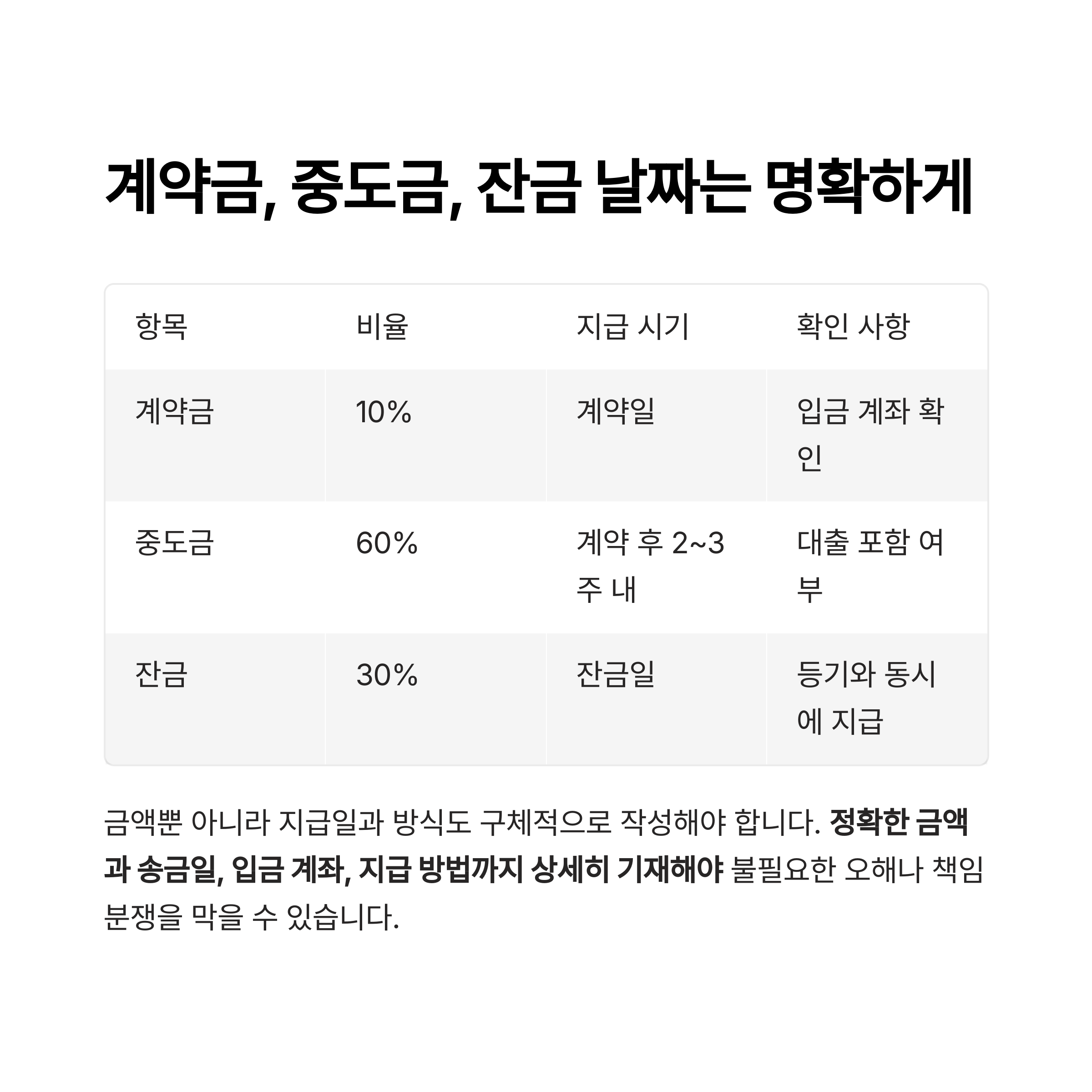 "계약금 10%, 중도금 60%, 잔금 30%"와 같은 비율만 쓰는 것이 아니라