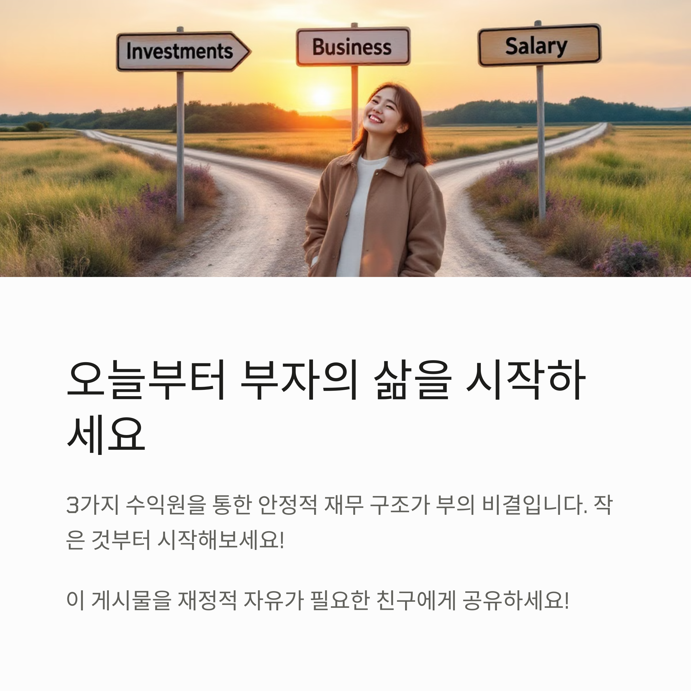 오늘 함께 살펴본 '부자가 되려면 꼭 가져야 할 3가지 수익원' 어떠셨나요? 부자들은 언제나 수익원을 다각화하고 성장시켜왔습니다. 여러분도 근로소득, 사업소득, 투자소득을 균형 있게 만들어가면서 경제적 자유를 향해 한 걸음씩 나아가시길 응원합니다. 작은 실천이 큰 변화를 만들 수 있습니다. 오늘부터 바로 시작해보세요!