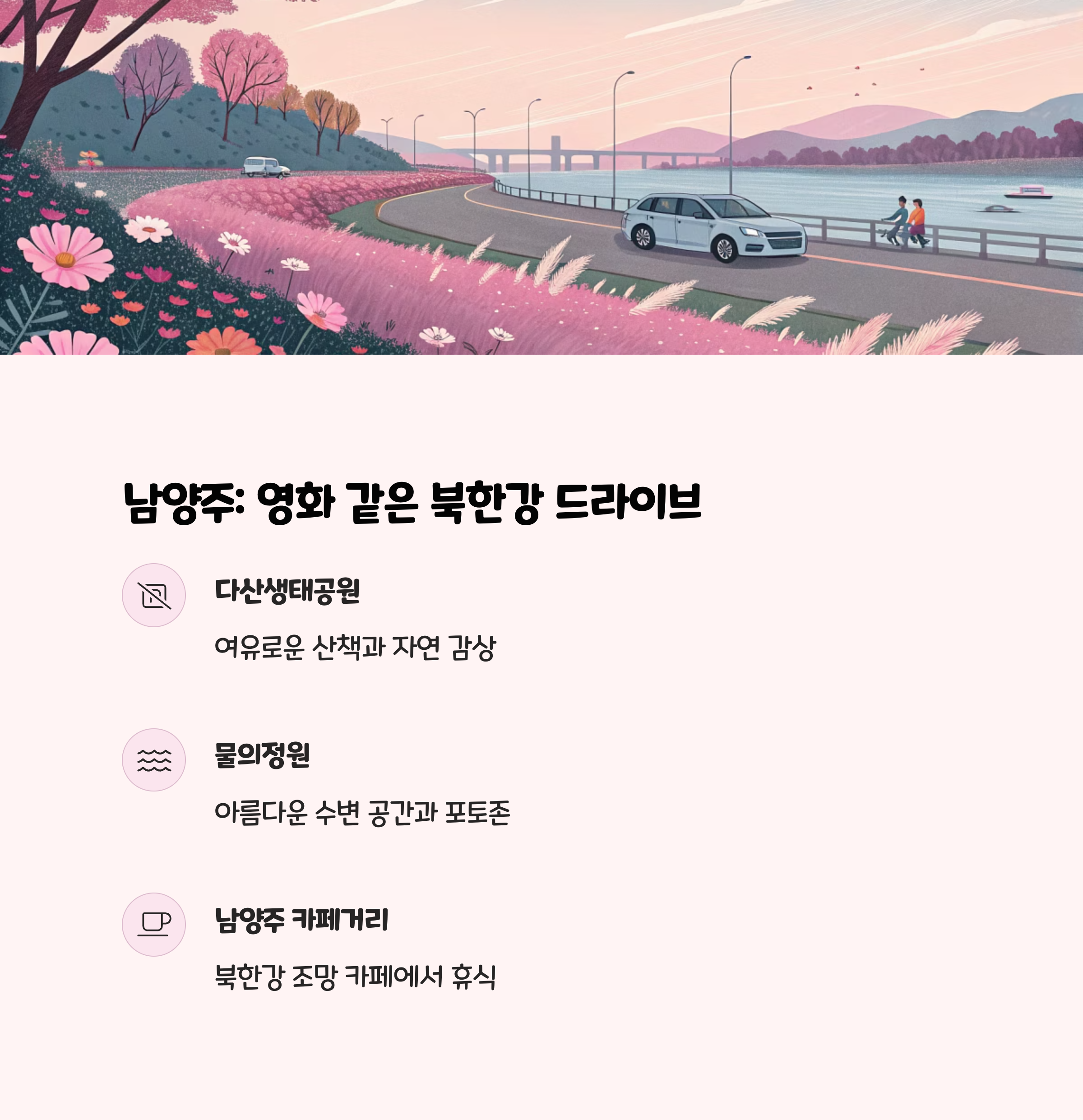 남양주는 자연 속 여유와 드라이브 감성을 동시에 느낄 수 있는 곳입니다.