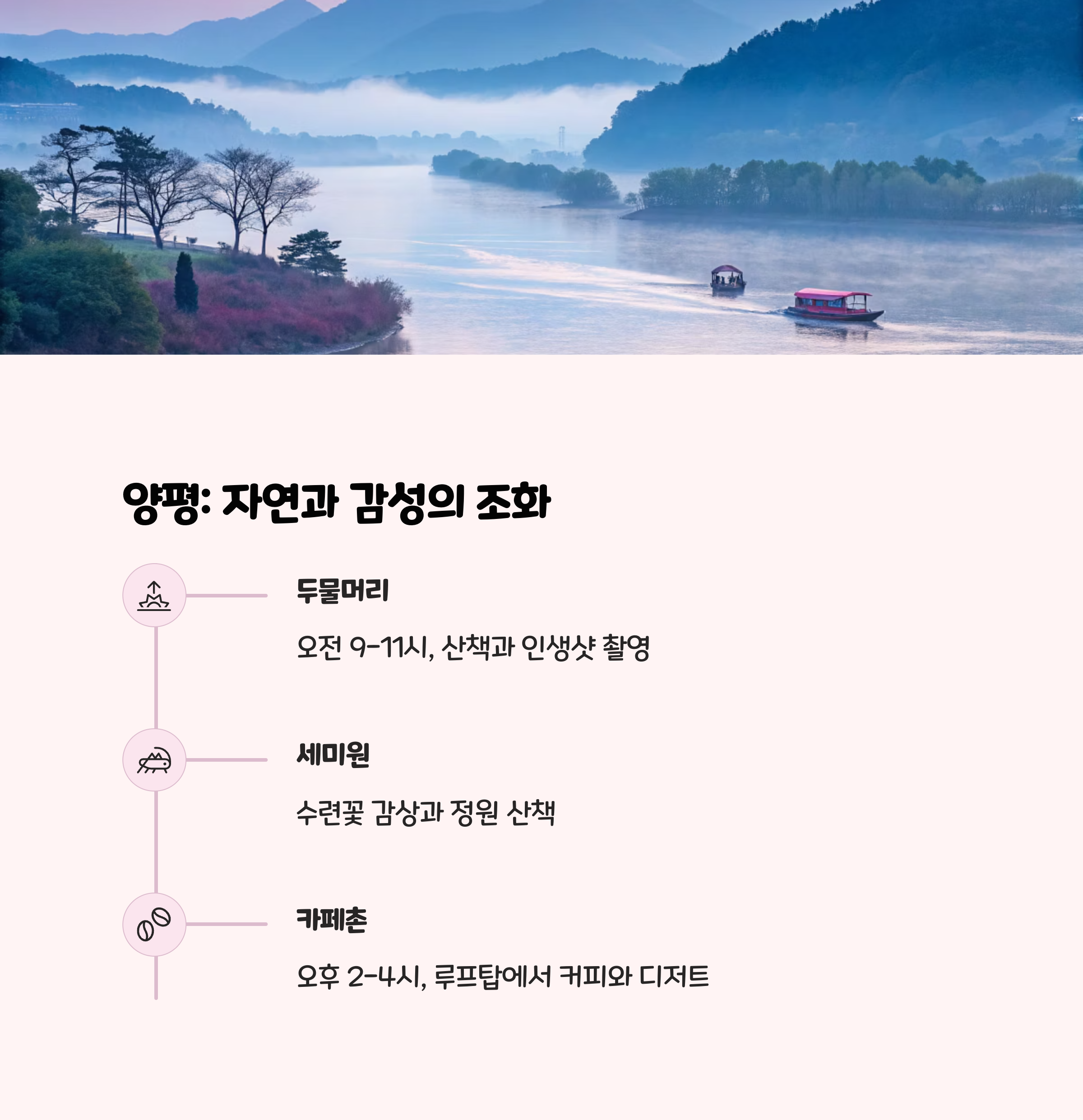 | 양평 | 두물머리 – 세미원 – 카페촌 | 감성, 강변, 힐링 |