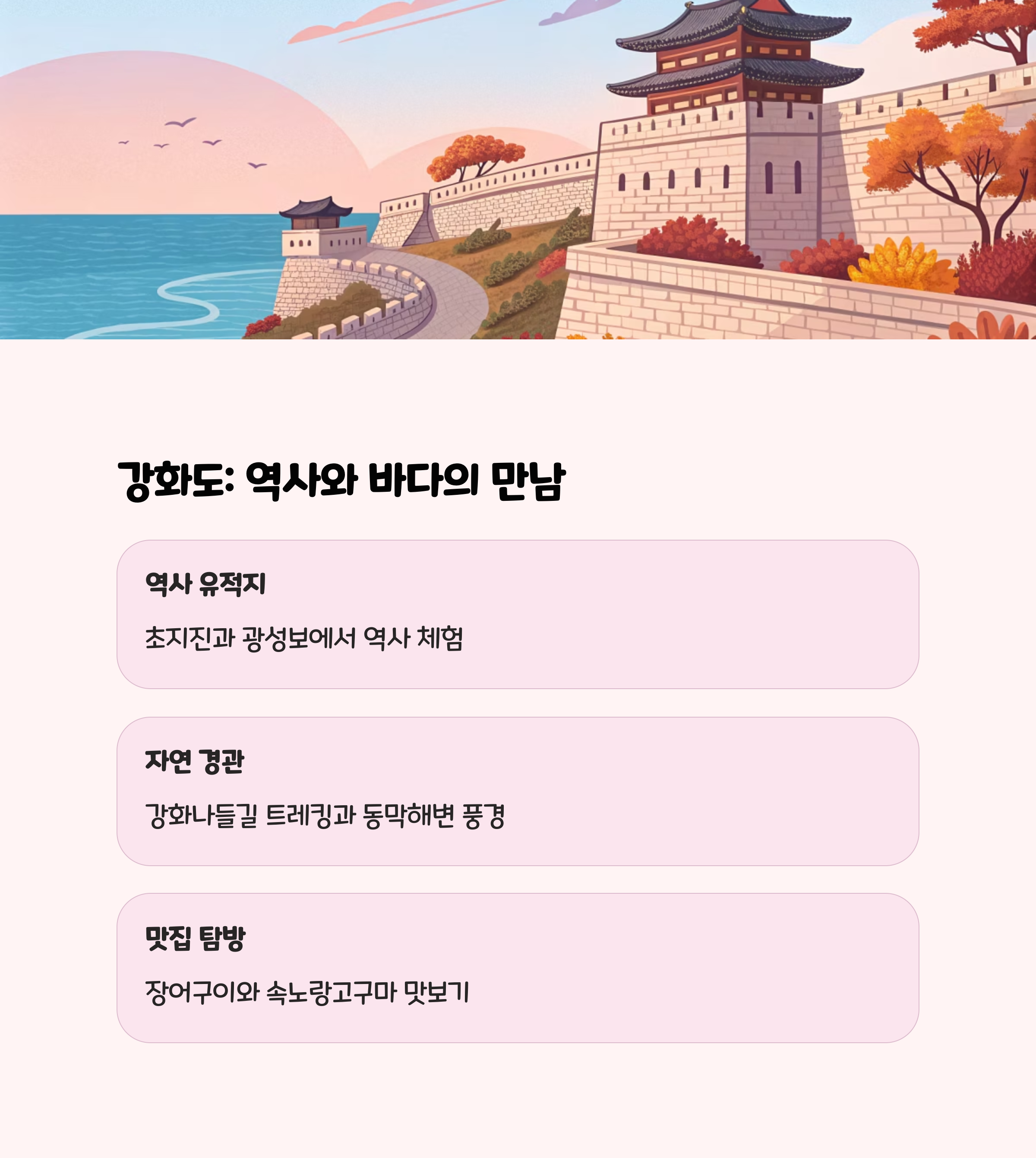 | 강화도 | 초지진 – 전등사 – 동막해변 | 역사, 바다, 먹거리 |