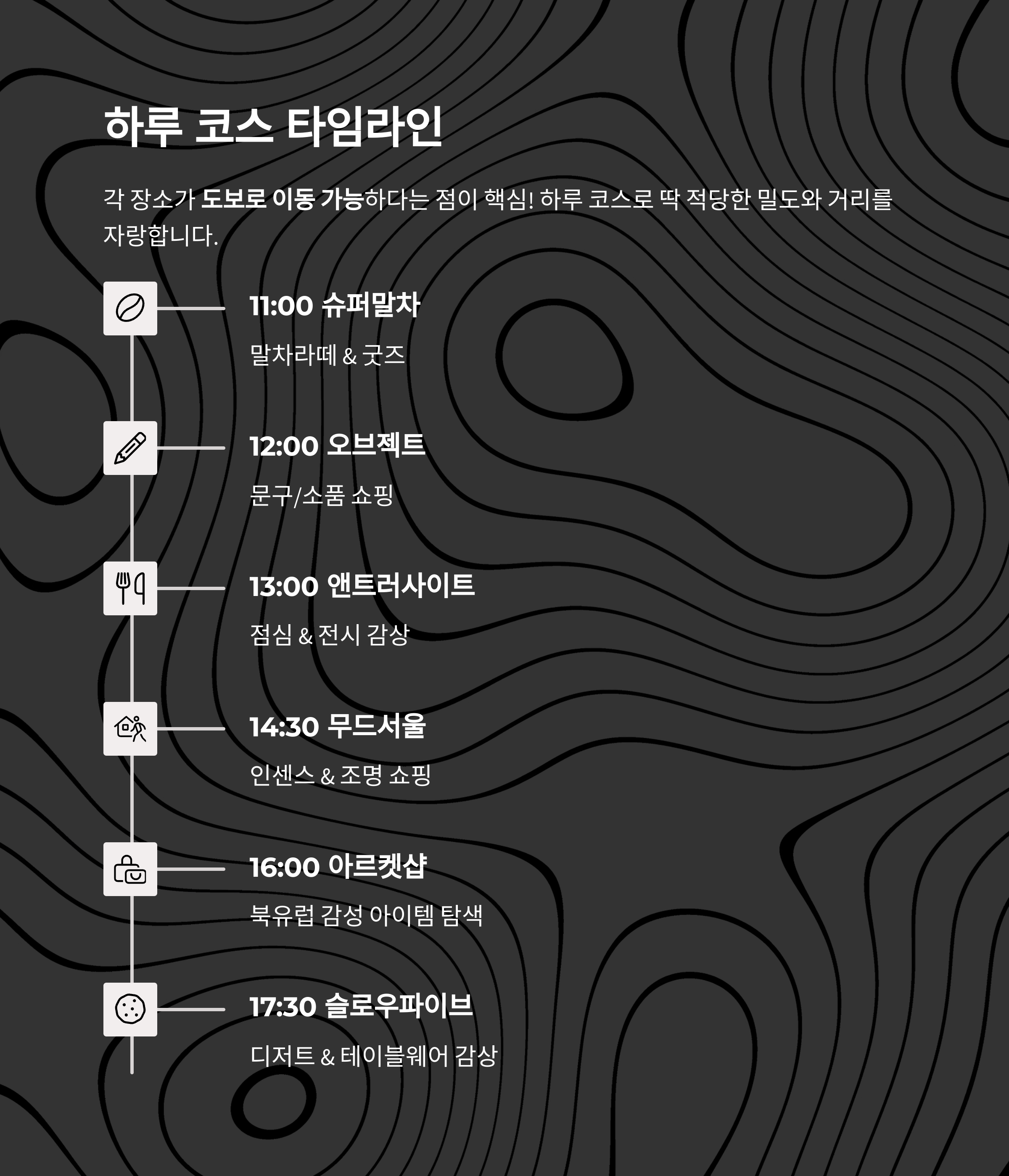 하루 코스를 따라 여유롭게 걸으며 나만의 감성을 채워보세요.