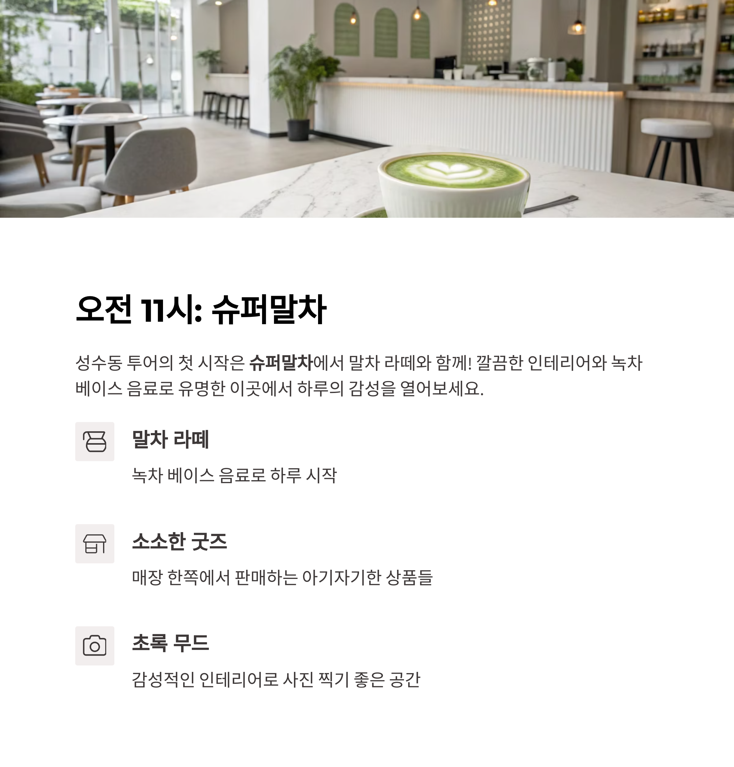 오전 11시: ‘슈퍼말차’에서 말차 라떼로 시작