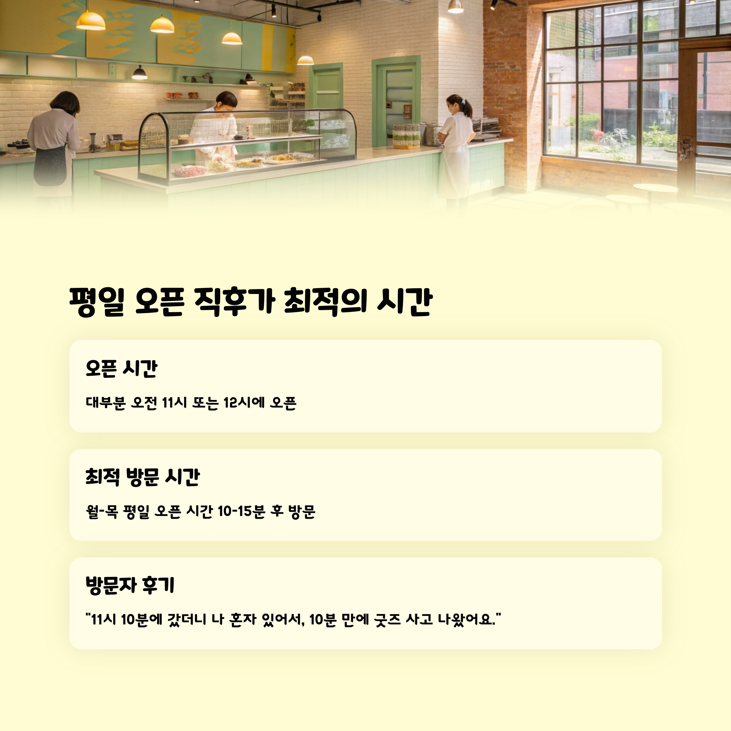 목 평일 오픈 시간 1015분 후 방문 시 대기 줄 없이 입장이 가능한 경우가 많습니다.