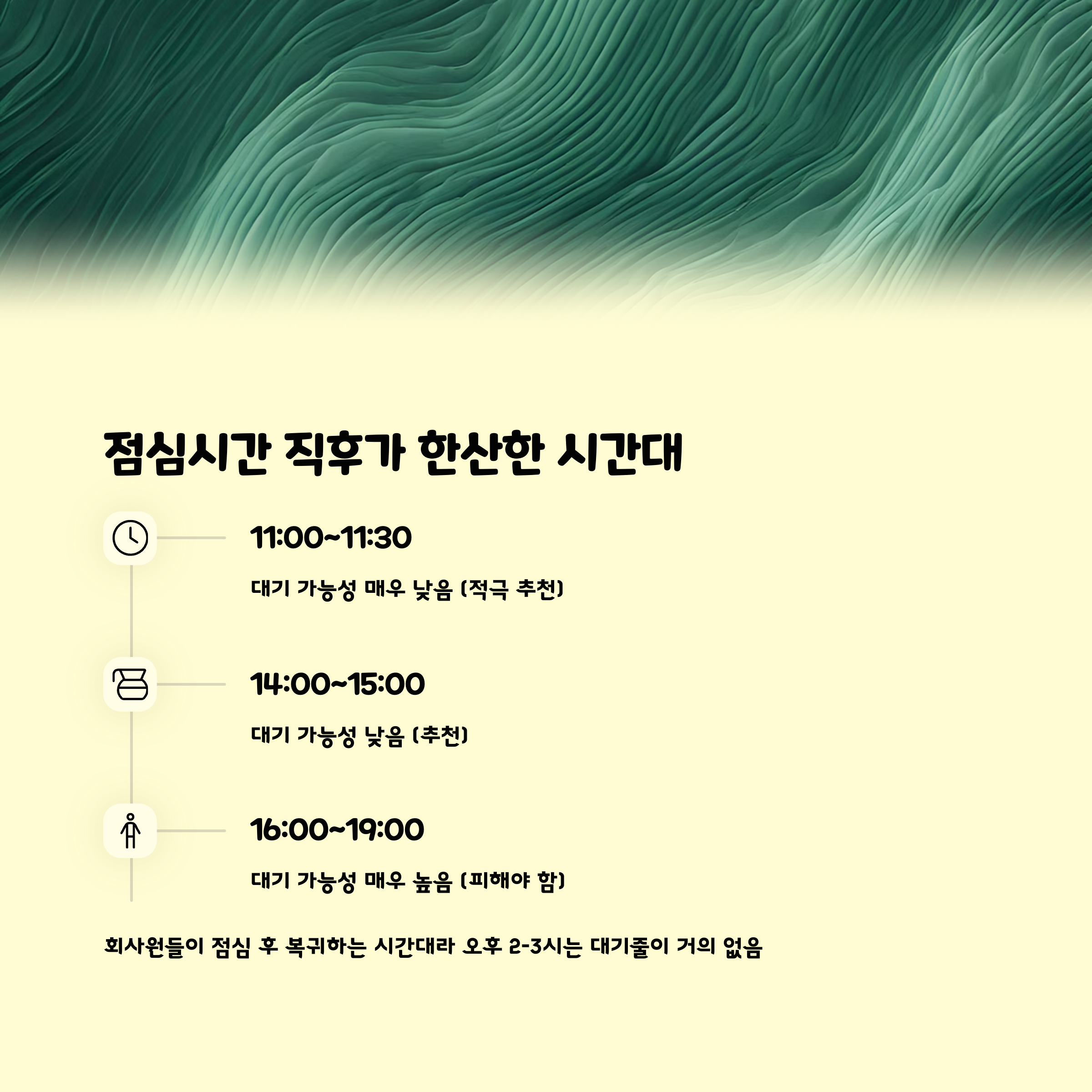 • 최적 시간: 평일 11시11시 30분, 또는 오후 2시3시