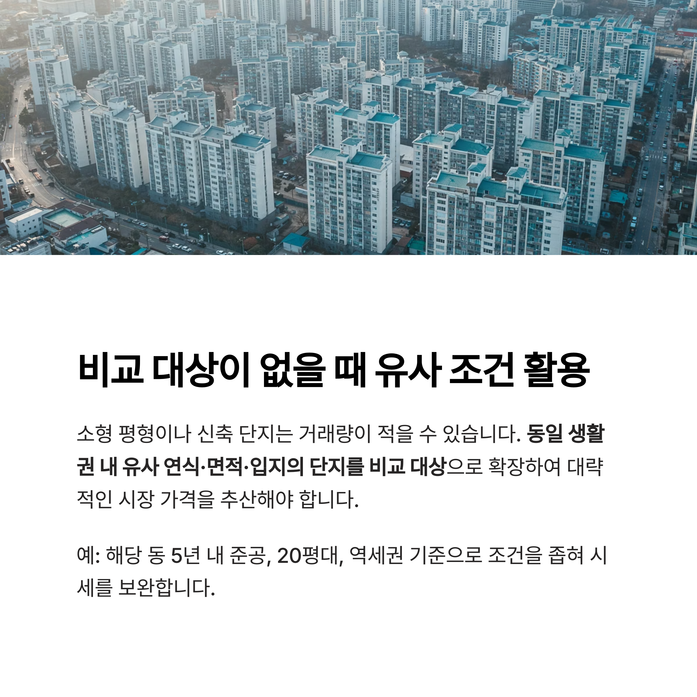 예: 해당 동 5년 내 준공, 20평대, 역세권 기준으로 조건을 좁혀 시세를 보완합니다.