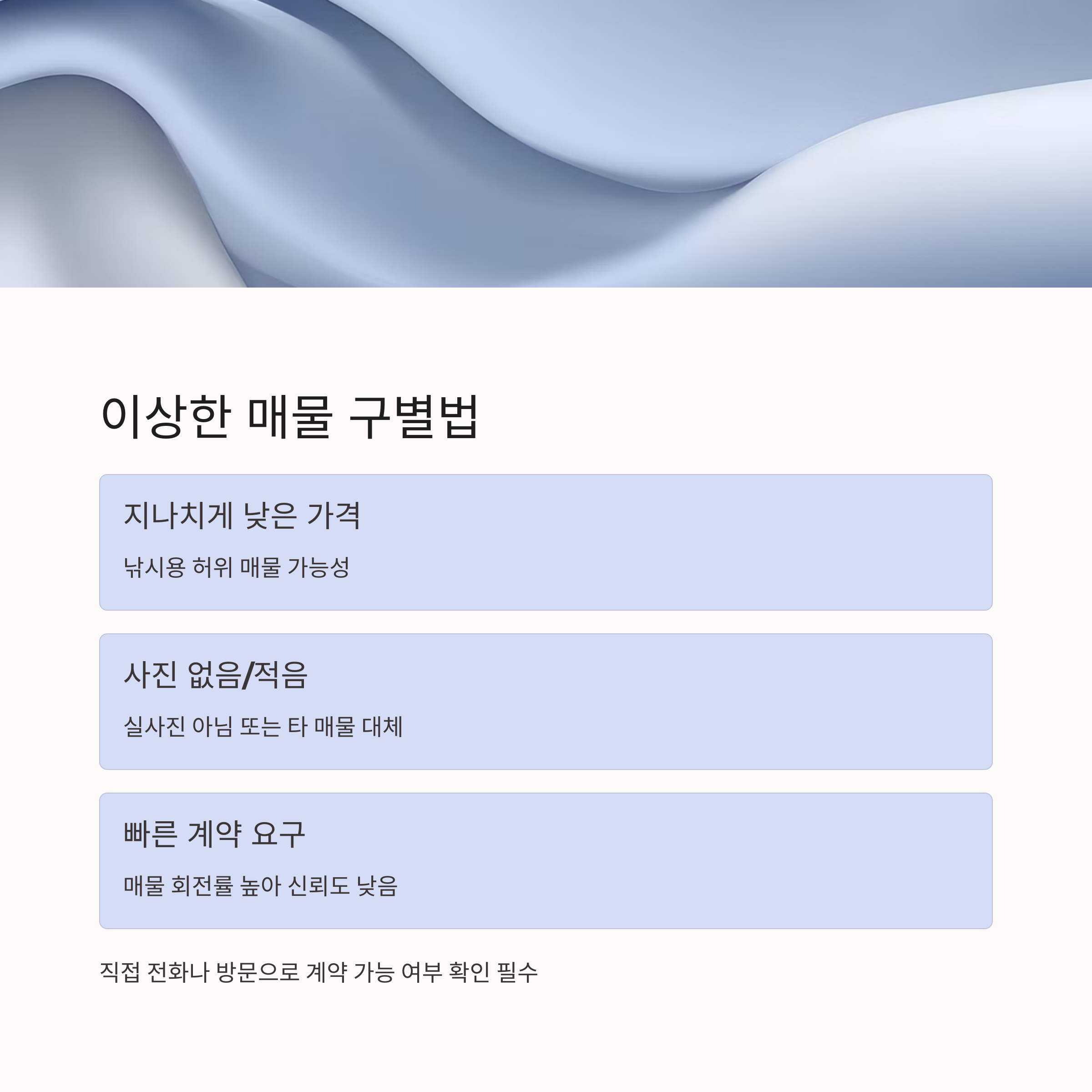 | 지나치게 낮은 가격 | 낚시용 허위 매물 가능성 |