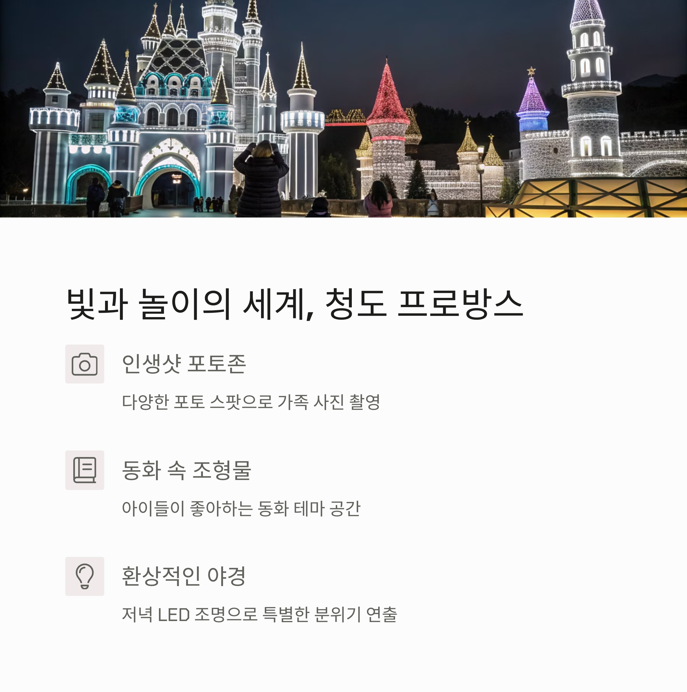 | 청도 프로방스 | 경북 | 포토존+빛의 조형물 | 유아~초등 | 실외 (야경) |