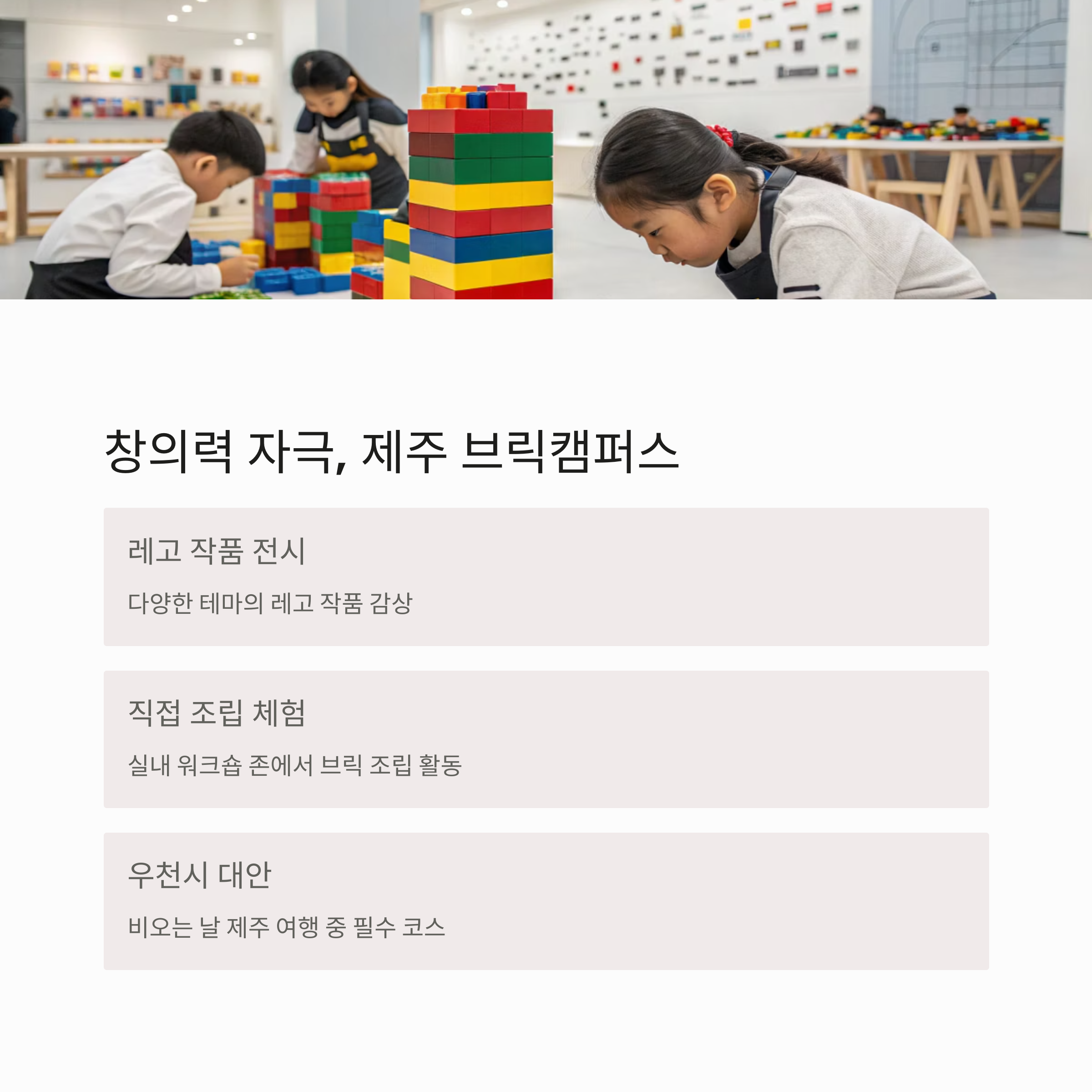 | 브릭캠퍼스 | 제주 | 레고 전시/조립 체험 | 4세 이상 | 실내 |