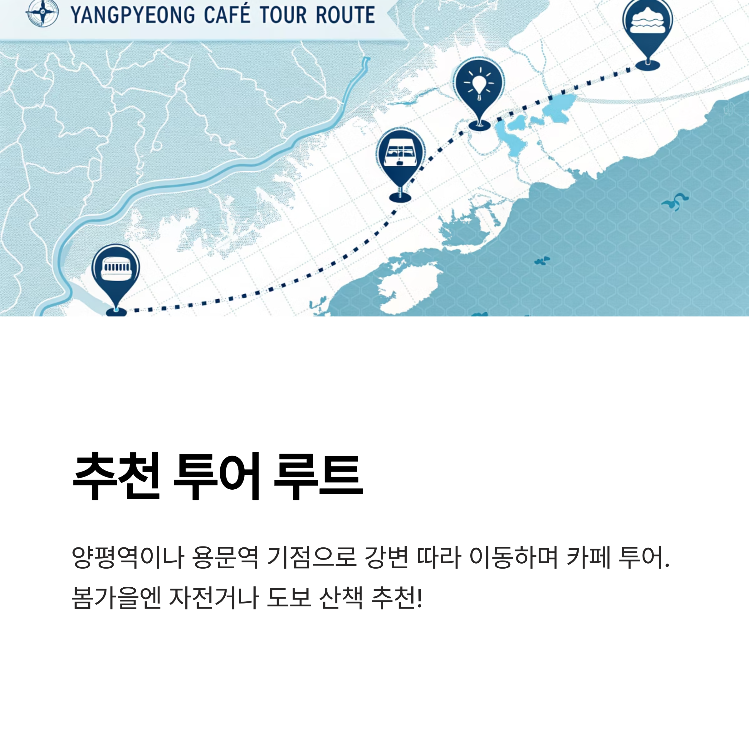 양평역이나 용문역을 기점으로 강변을 따라 이동하면 여러 카페를 한 번에 둘러볼 수 있습니다.
