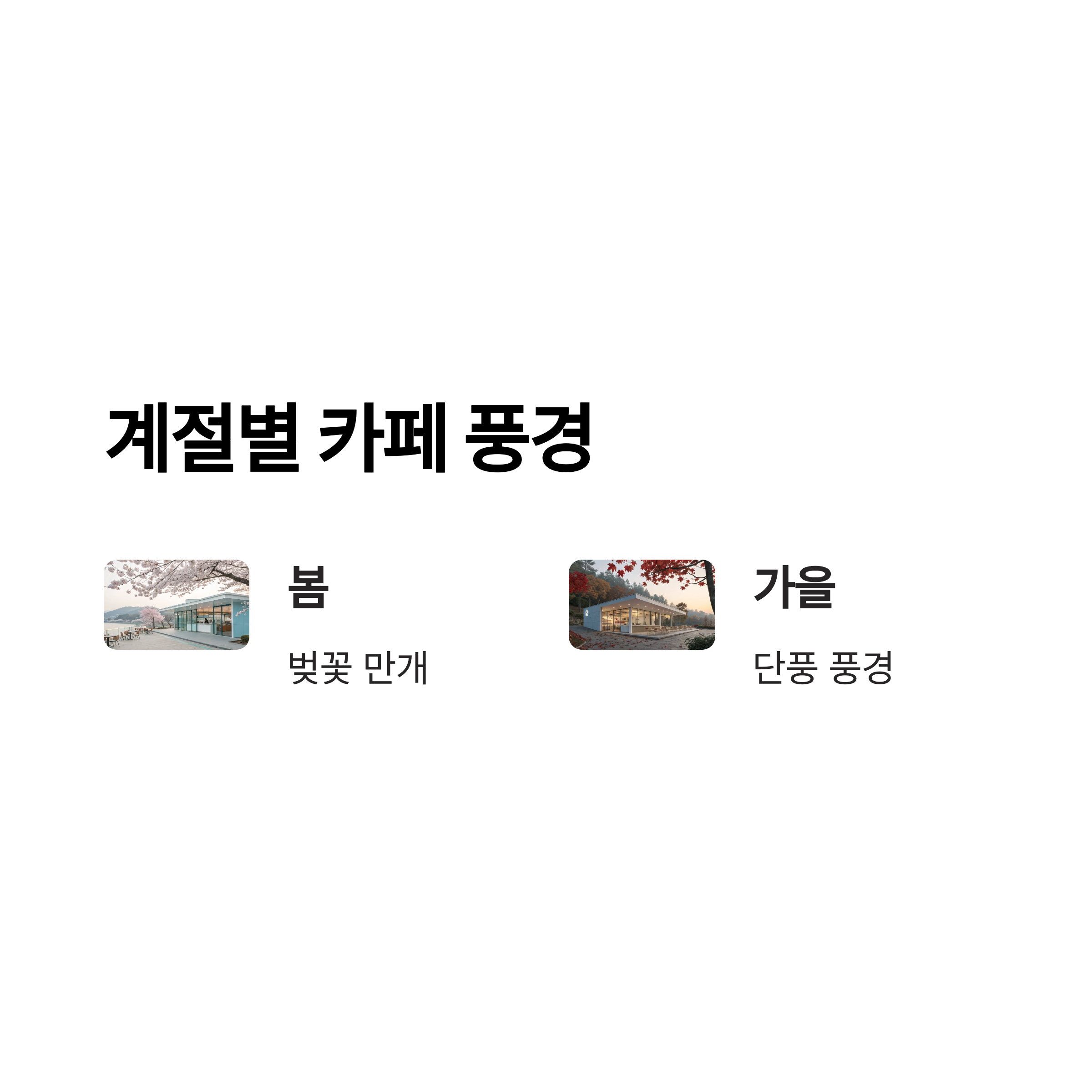 야외 테라스나 유리창 너머로 펼쳐지는 계절별 풍경이 카페 방문의 또 다른 재미입니다.