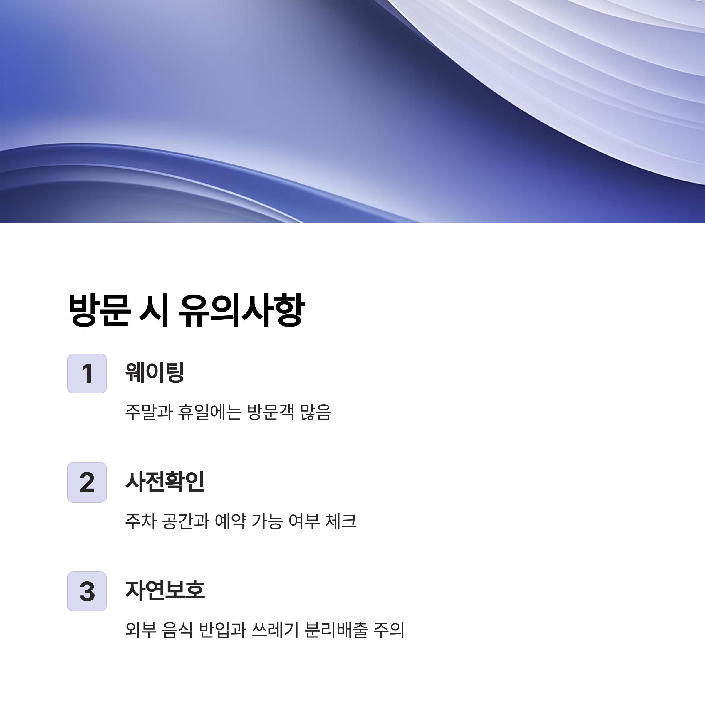 자연 보호를 위해 외부 음식 반입과 쓰레기 분리배출에 신경 써야 합니다.