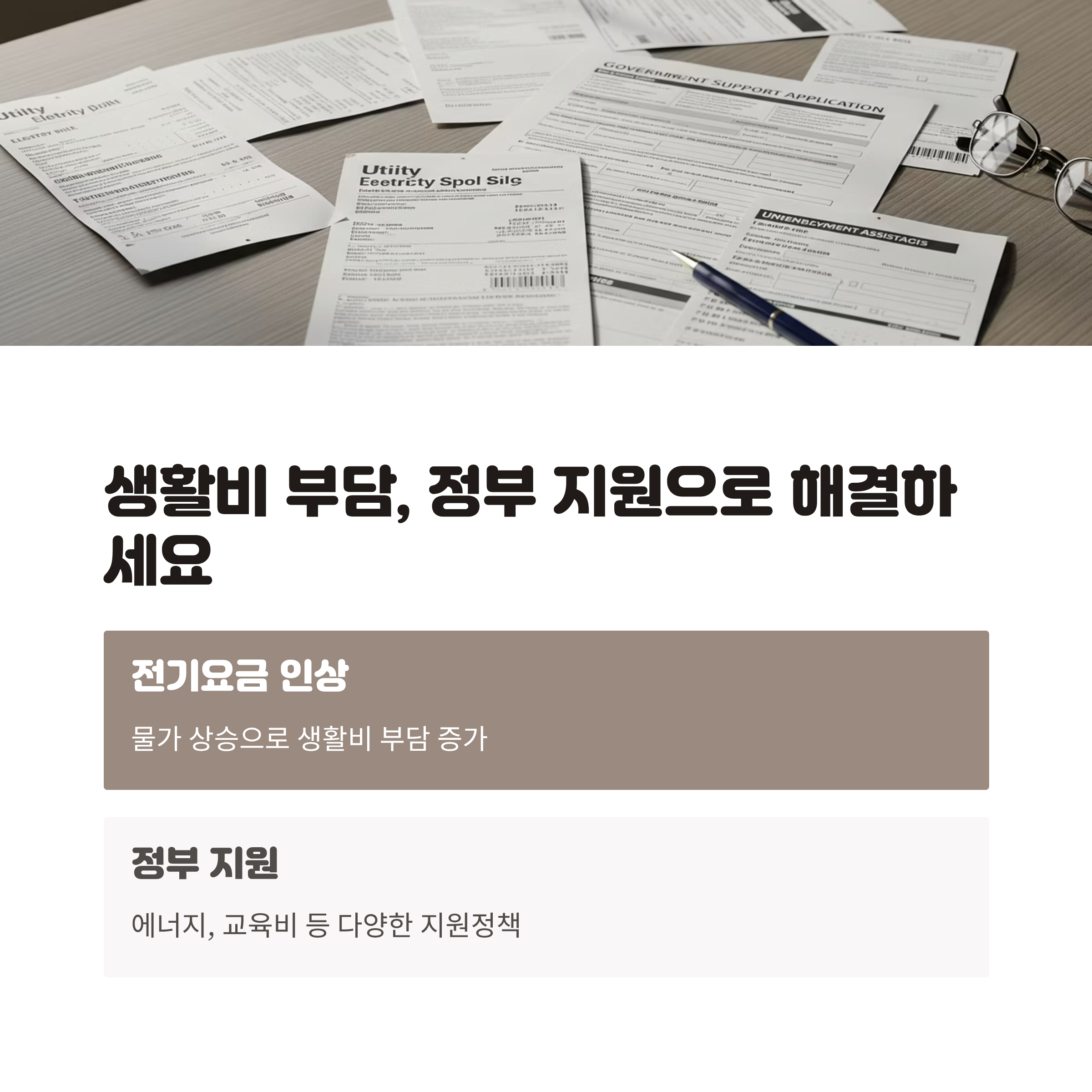 최근 전기요금 인상과 물가 상승으로 생활비 부담이 점점 커지고 있습니다. 다행히 정부에서는 에너지 요금부터 교육비까지 다양한 지원정책을 통해 국민들의 부담을 덜어주고 있는데요. 이 글에서는 지금 바로 신청 가능한 전기료, 가스비, 학자금, 주거비 등 핵심 생활비 지원 제도를 정리해드립니다.