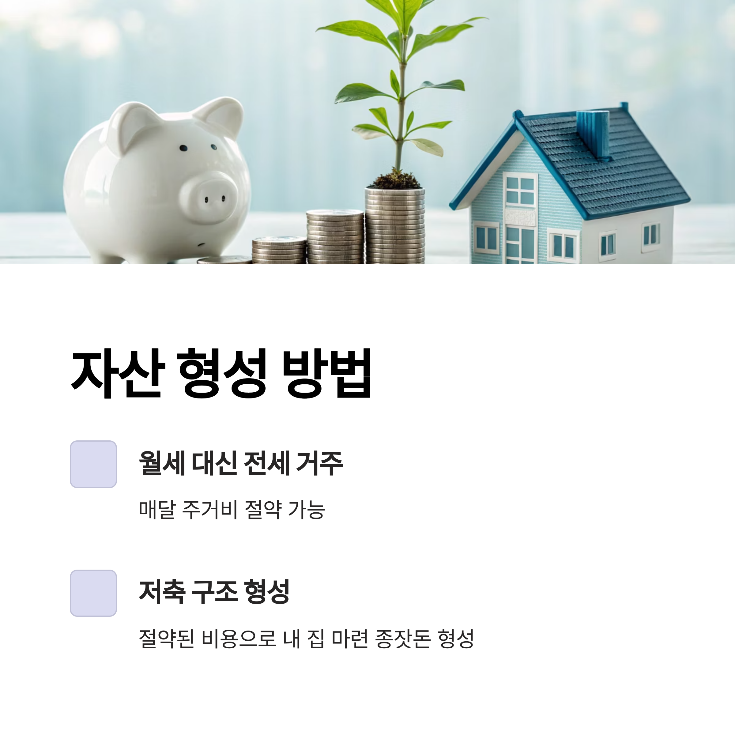 매달 부담해야 할 월세 대신 전세 거주 + 저축 구조를 만들 수 있어