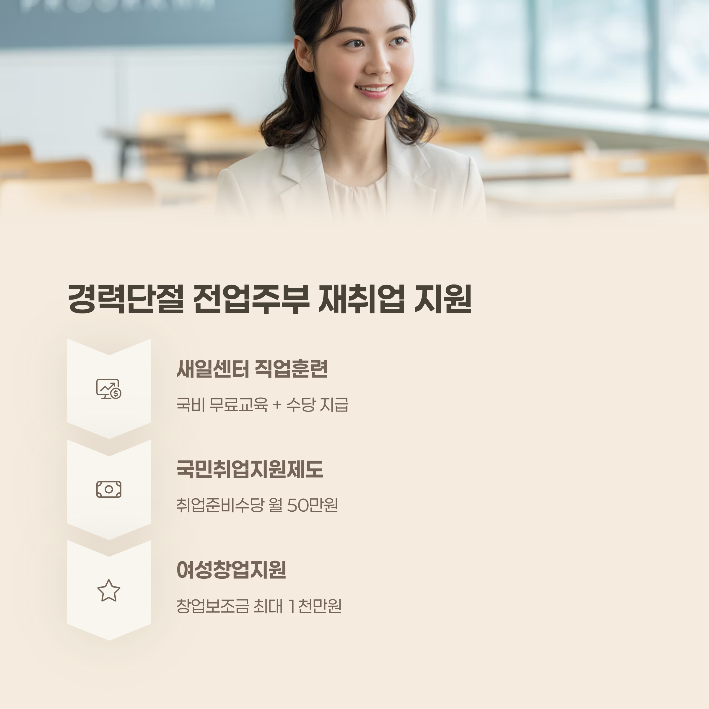 | 국민취업지원제도 | 취업준비수당 월 50만 원 | 구직 희망 주부 | 고용센터 |