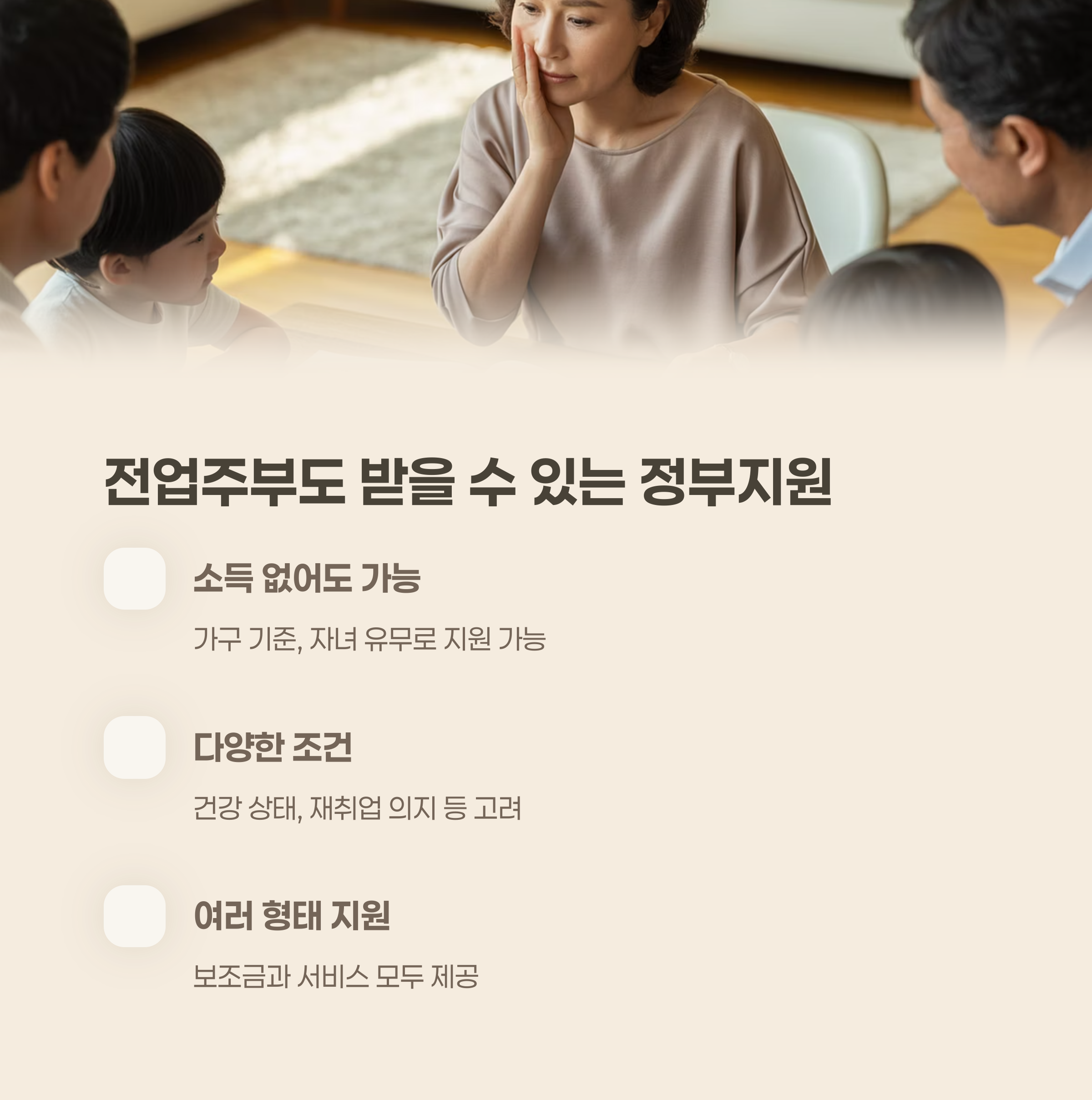"소득이 없어도, 가족 단위나 생활환경 기준으로 충분히 보조금을 신청할 수 있습니다."