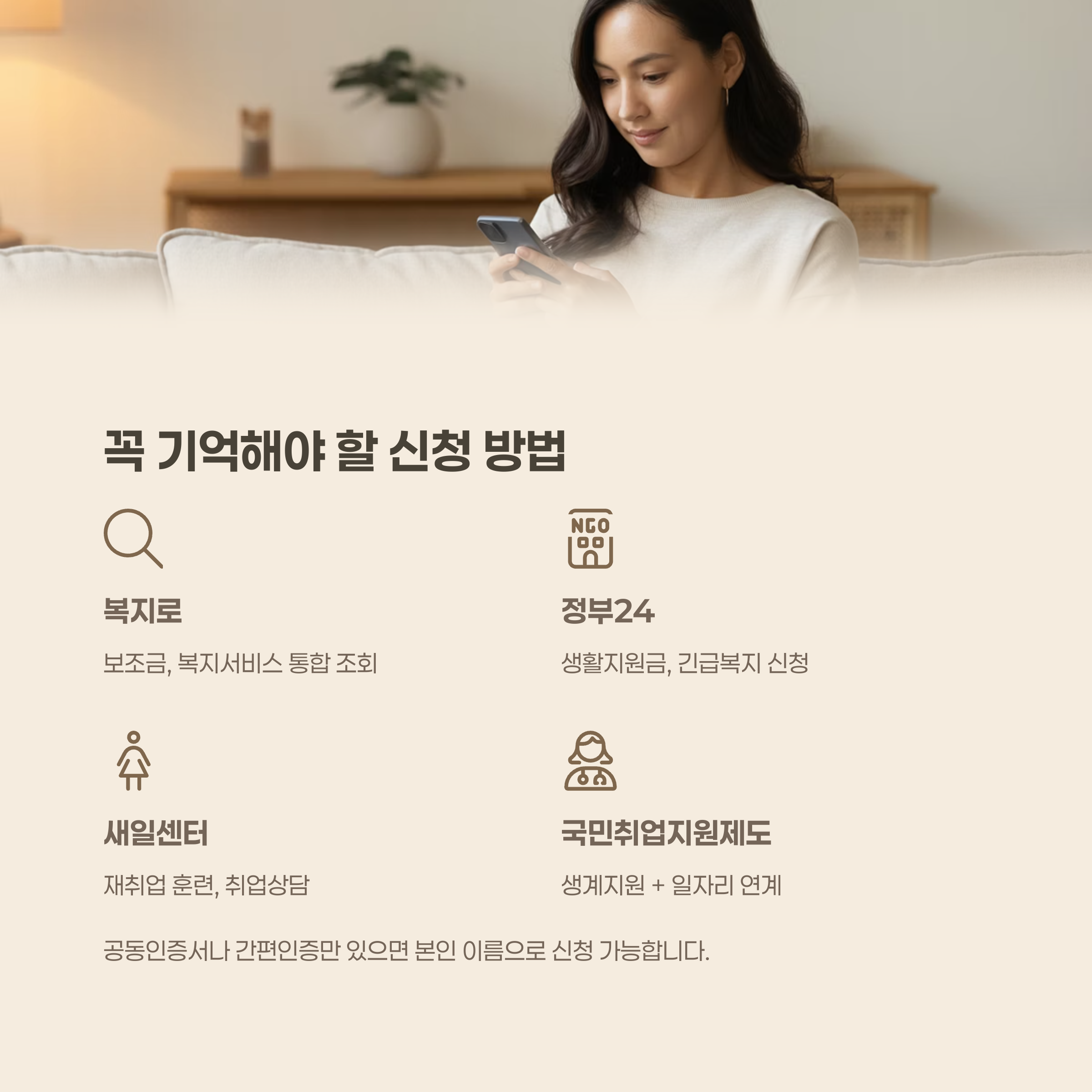 "공동인증서나 간편인증만 있으면, 전업주부 본인 이름으로도 신청 가능합니다."