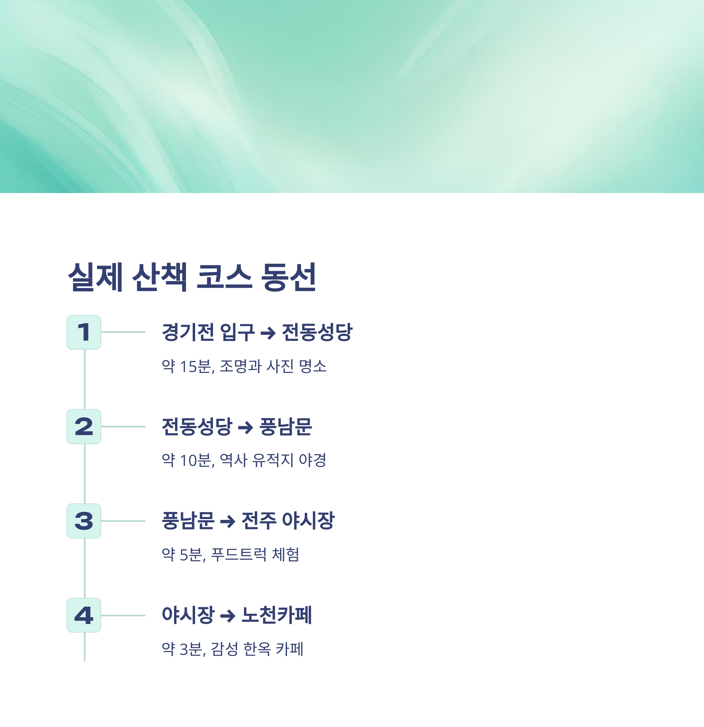 | 경기전 입구 → 전동성당 | 약 15분 | 조명+사진 명소, 벤치 많음 |