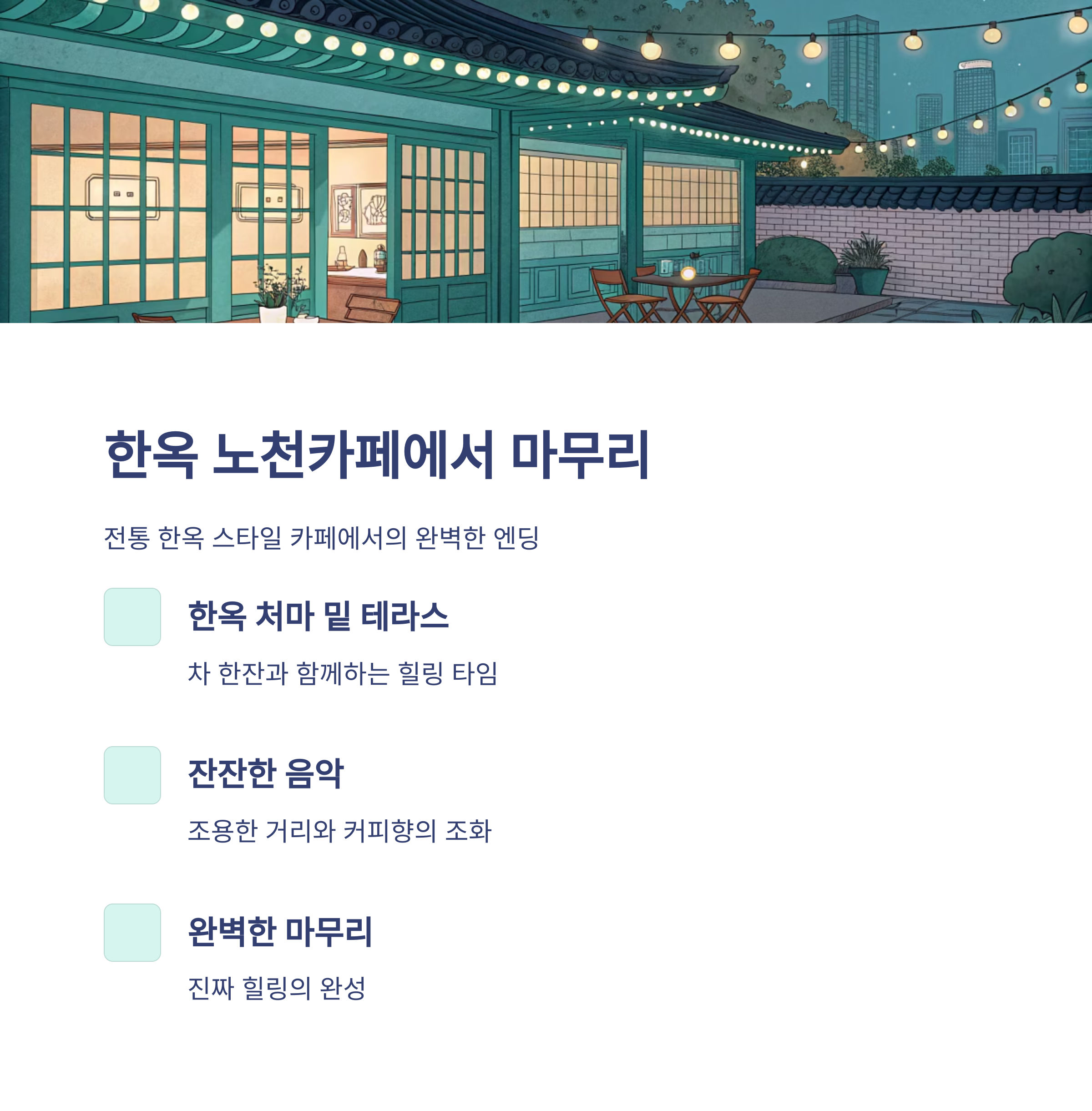 | 야시장 → 노천카페 골목 | 약 3분 | 감성적인 한옥 카페 밀집 지역 |