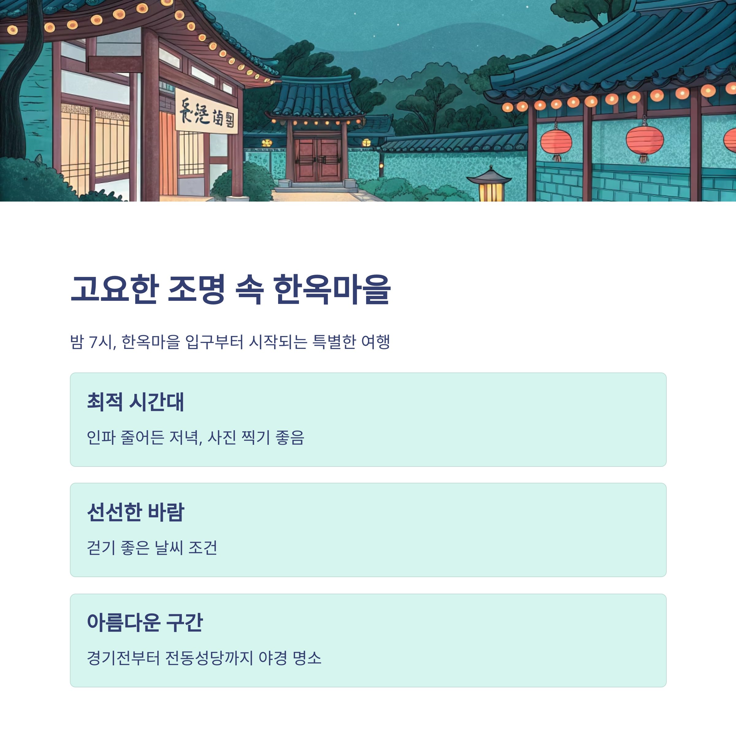 밤 7시, 한옥마을 입구로 들어서면 은은한 조명 속에 고즈넉한 한옥들이