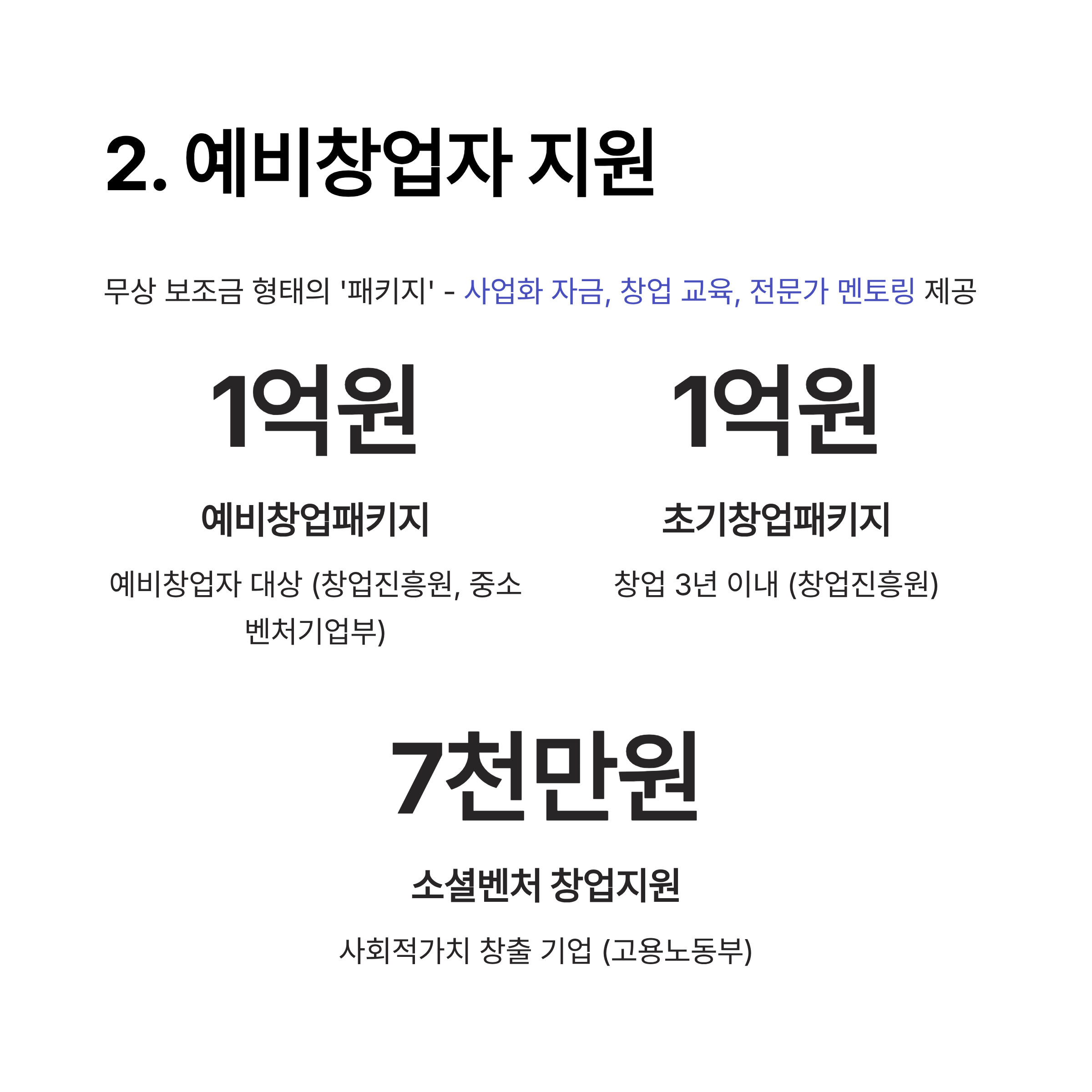 | 예비창업패키지 | 예비창업자 | 최대 1억 원 | 창업진흥원, 중소벤처기업부 |