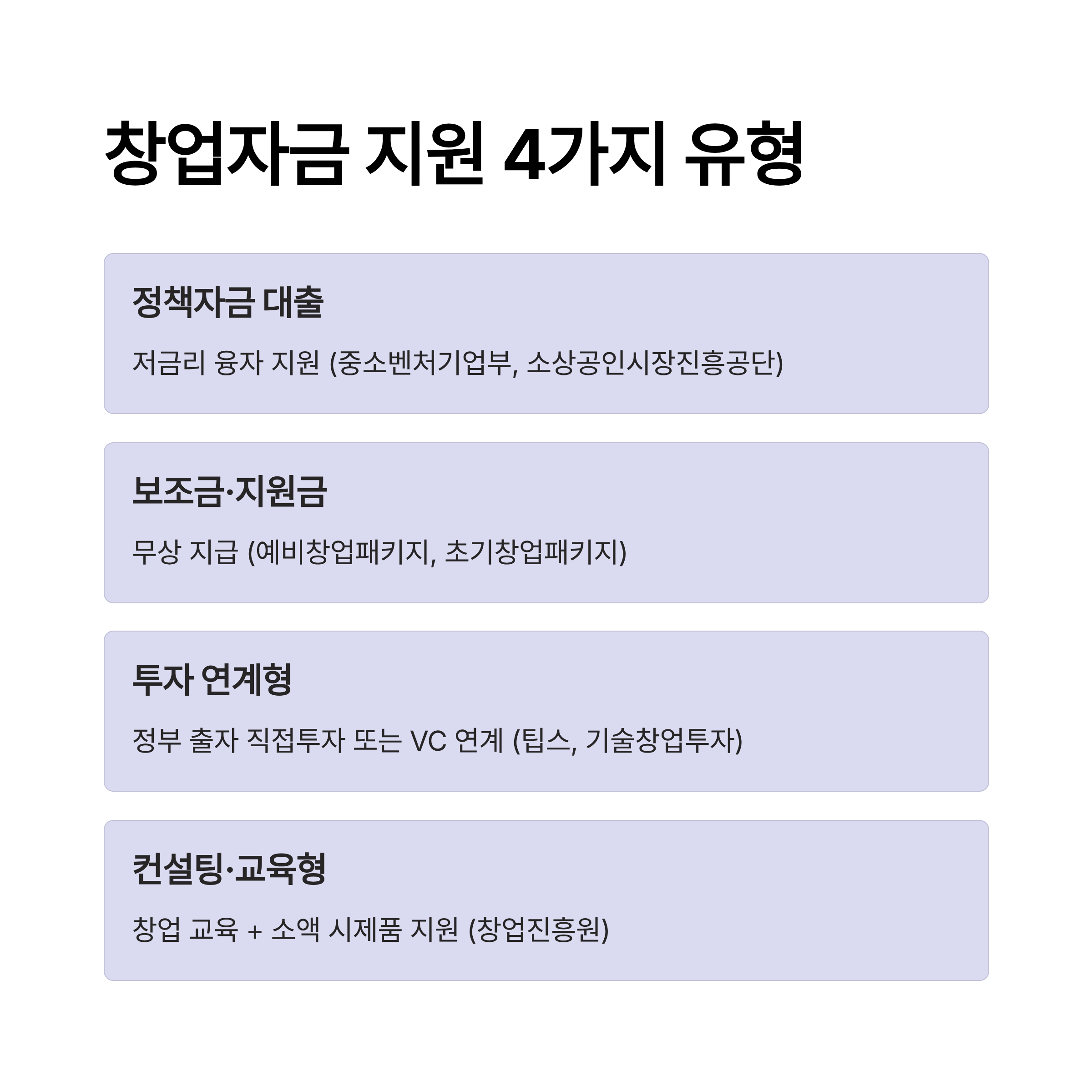 정부 창업지원금은 목적과 방식에 따라 아래 네 가지로 구분됩니다.