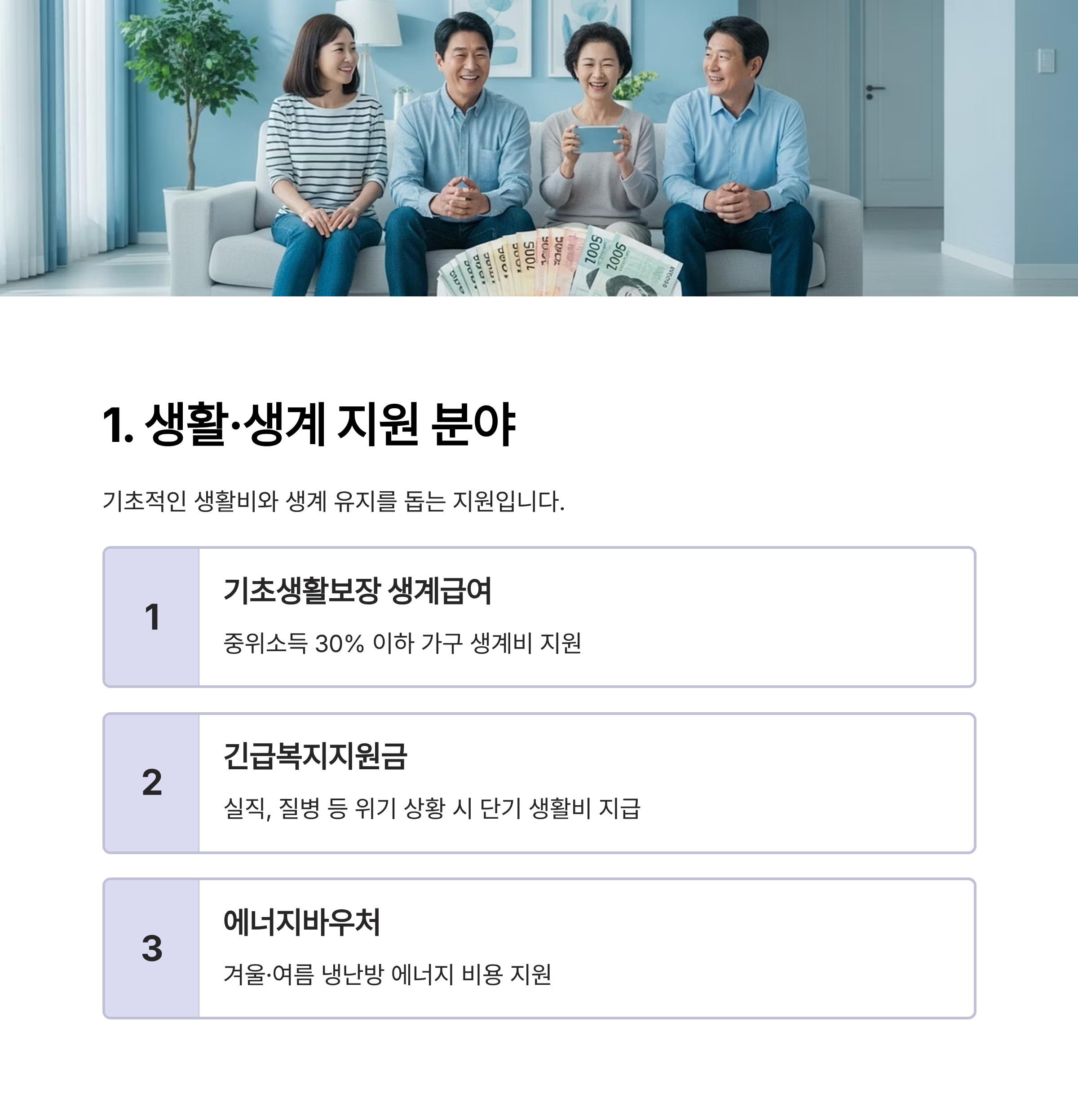 | 기초생활보장 생계급여 | 중위소득 30% 이하 가구 생계비 지원 |