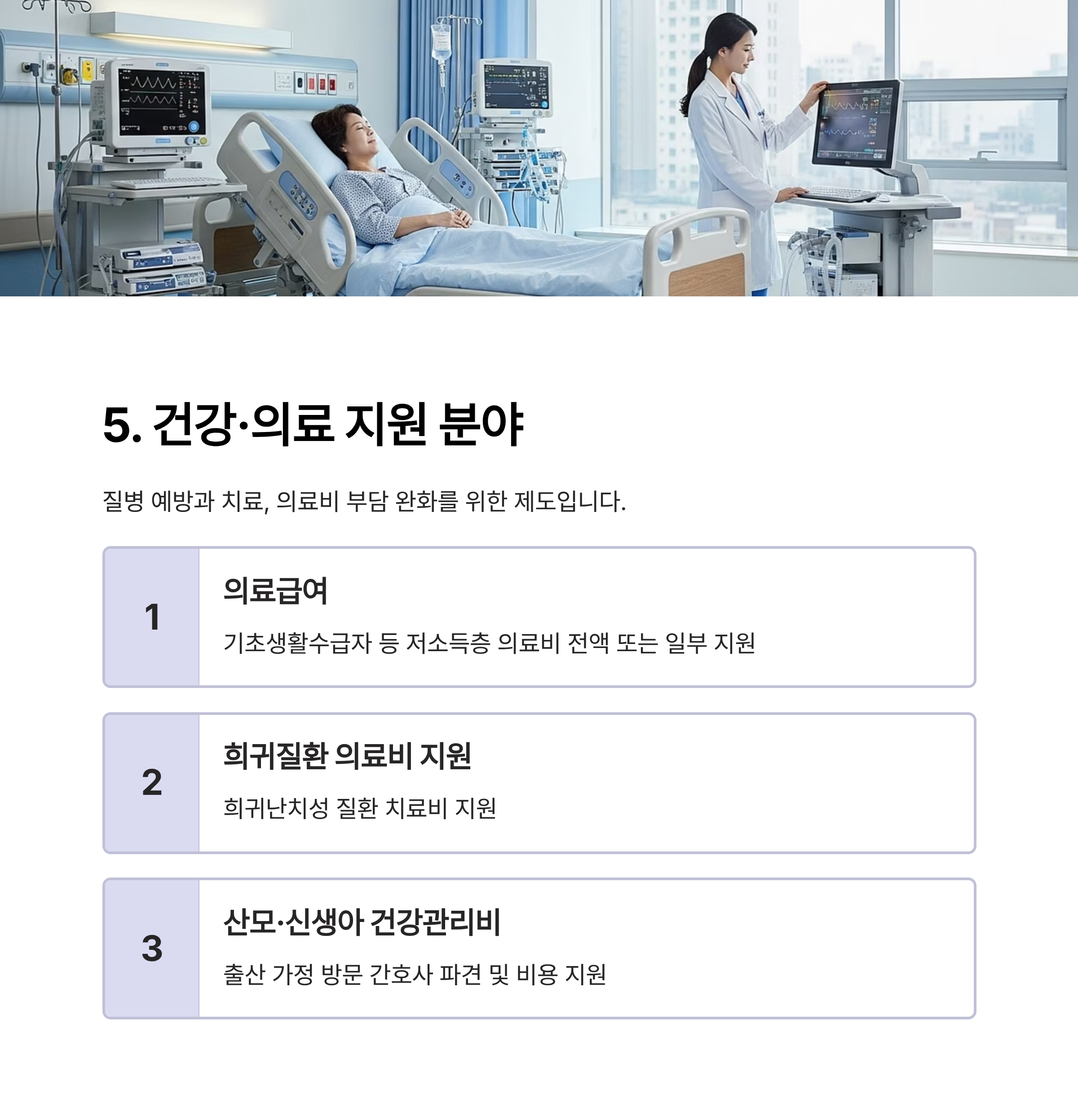 | 의료급여 | 기초생활수급자 등 저소득층 의료비 전액 또는 일부 지원 |