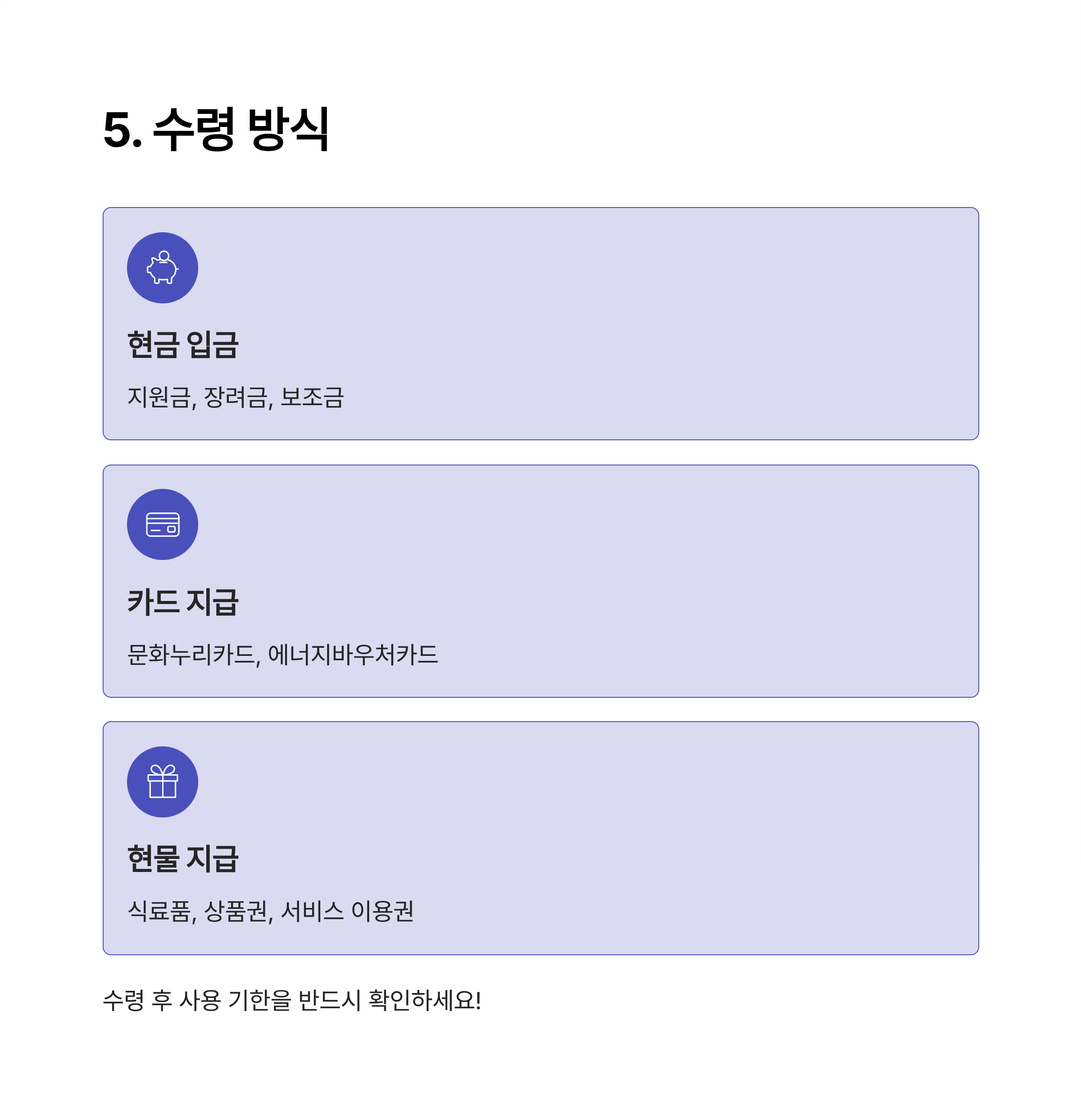 | 현물 지급 | 식료품, 상품권, 서비스 이용권 |