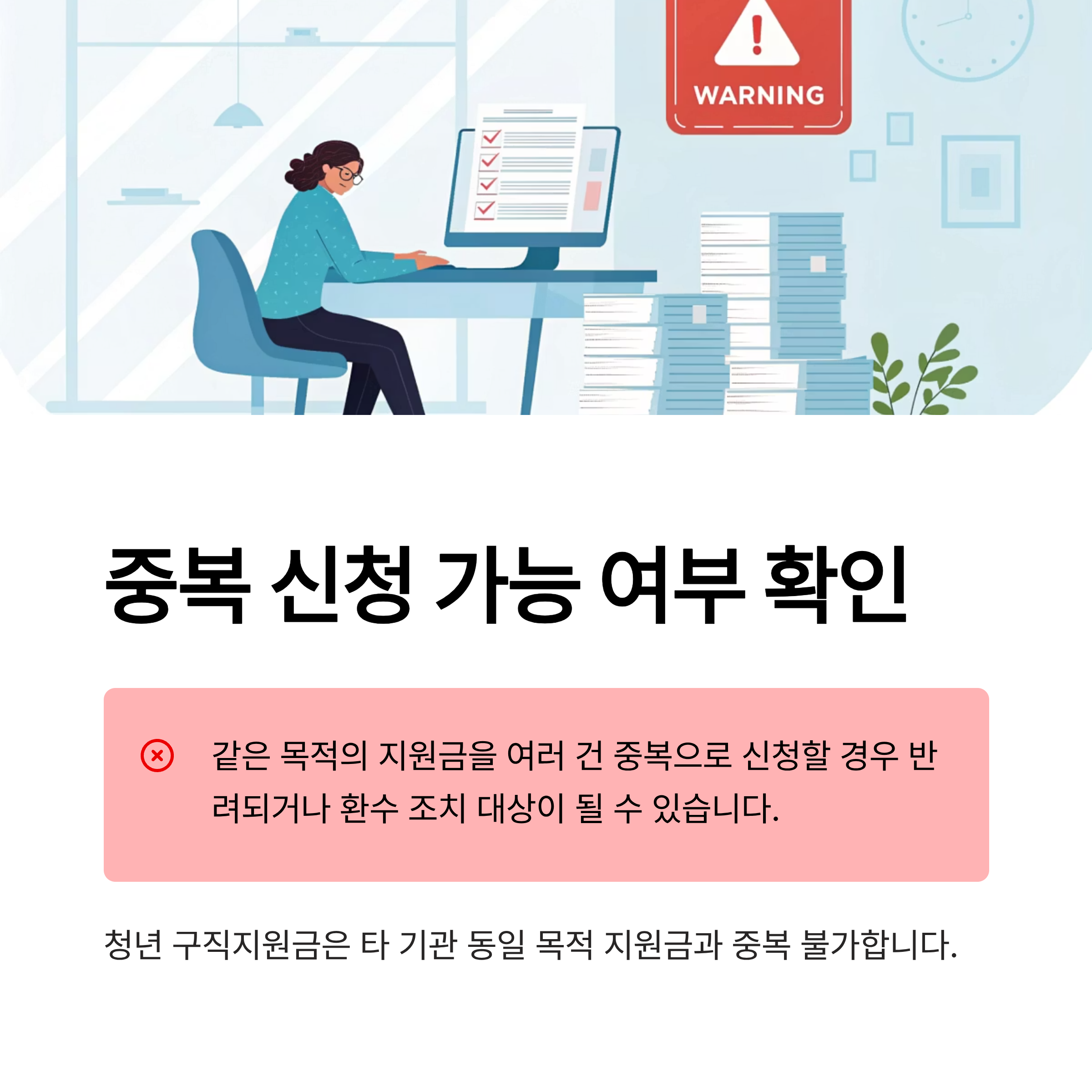 | 청년 구직지원금 | 타 기관 동일 목적 지원금과 중복 불가 |