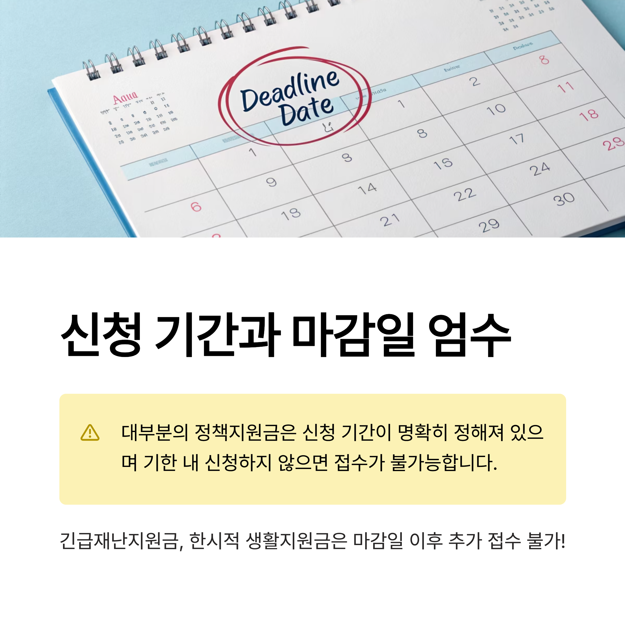 대부분의 정책지원금은 신청 기간이 명확히 정해져 있으며