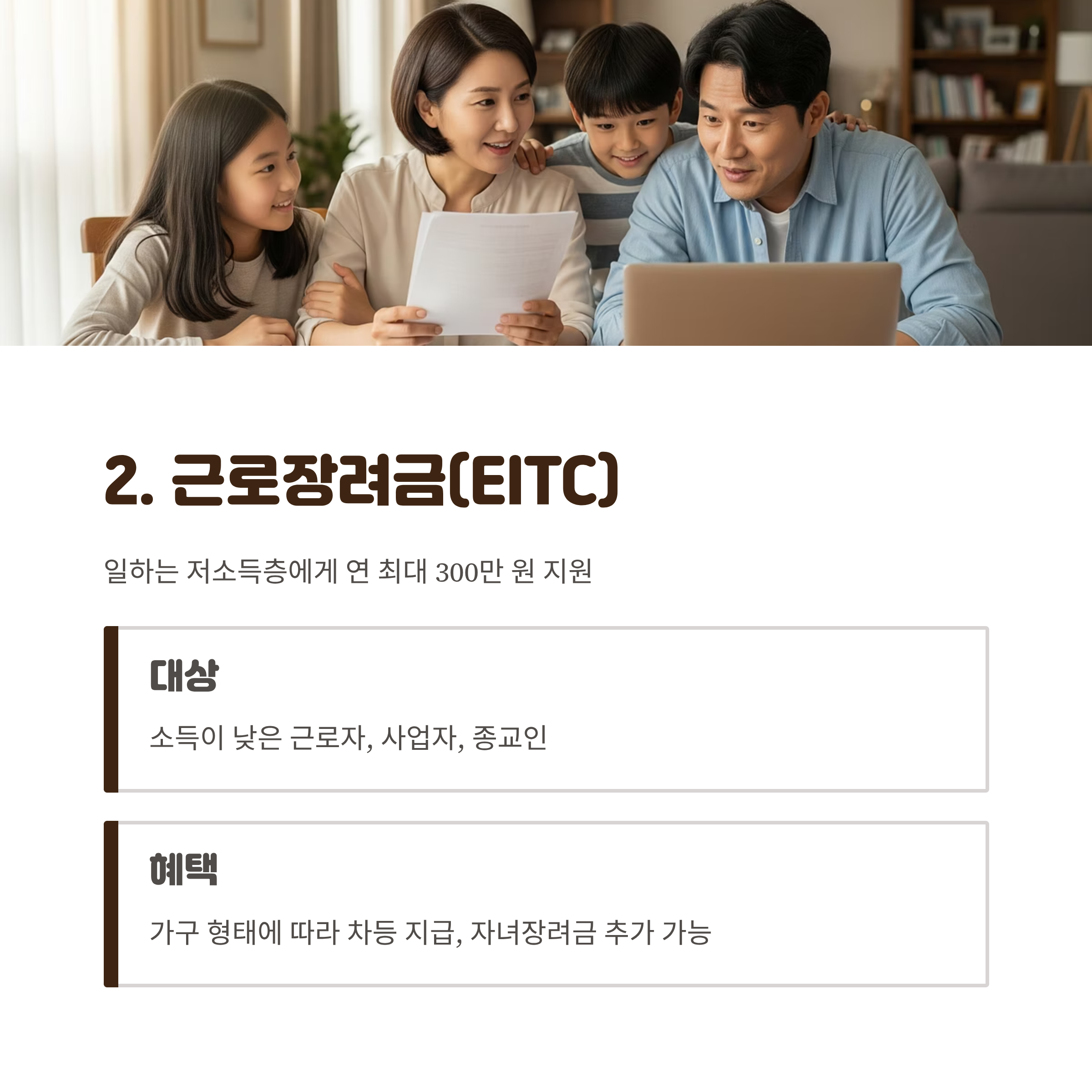 2. 근로장려금(EITC) – 일하는 저소득층에게 연 최대 300만 원