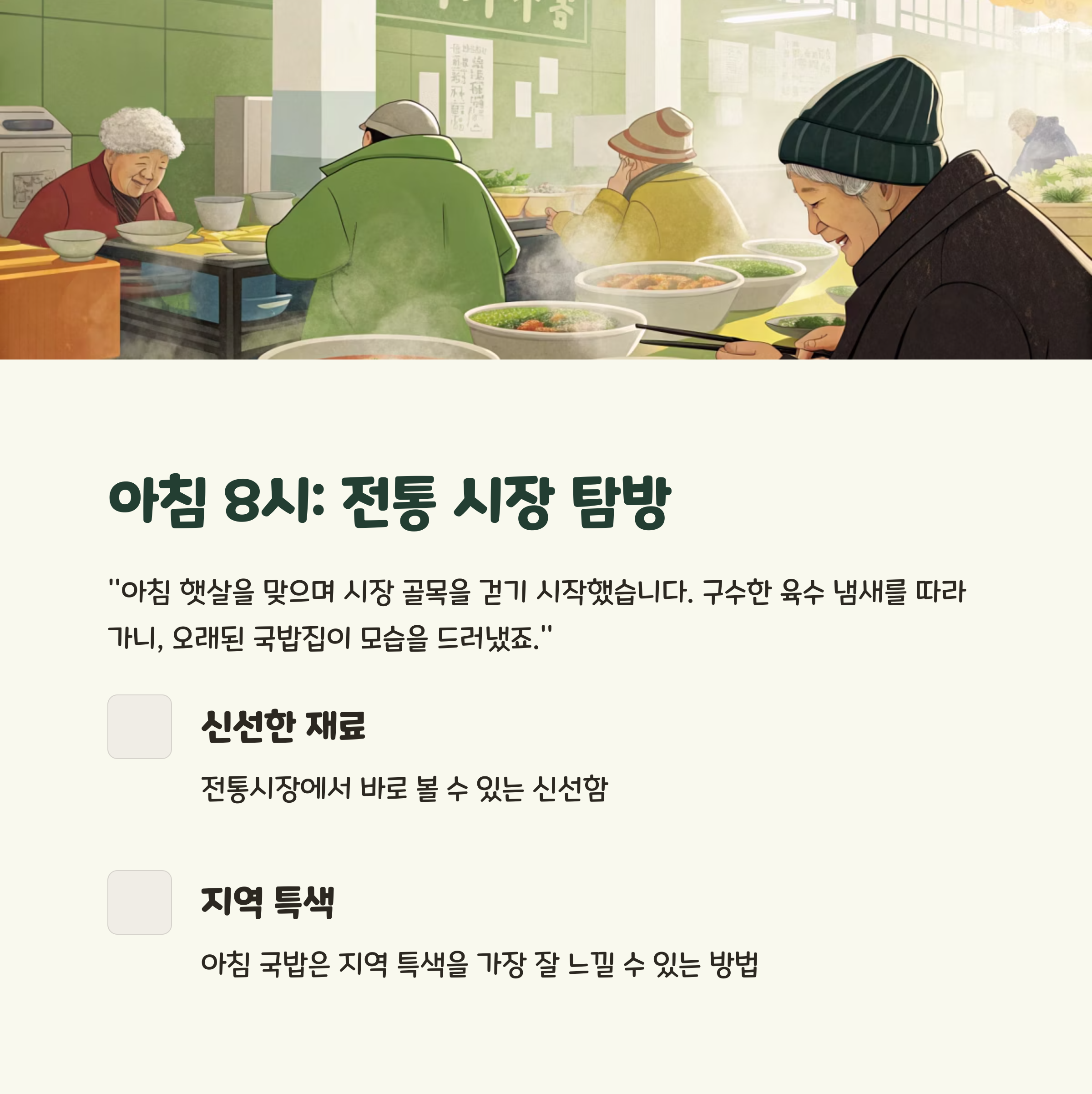 아침 8시: 전통 시장 탐방과 따끈한 국밥 한 그릇 (스토리텔링 형식)