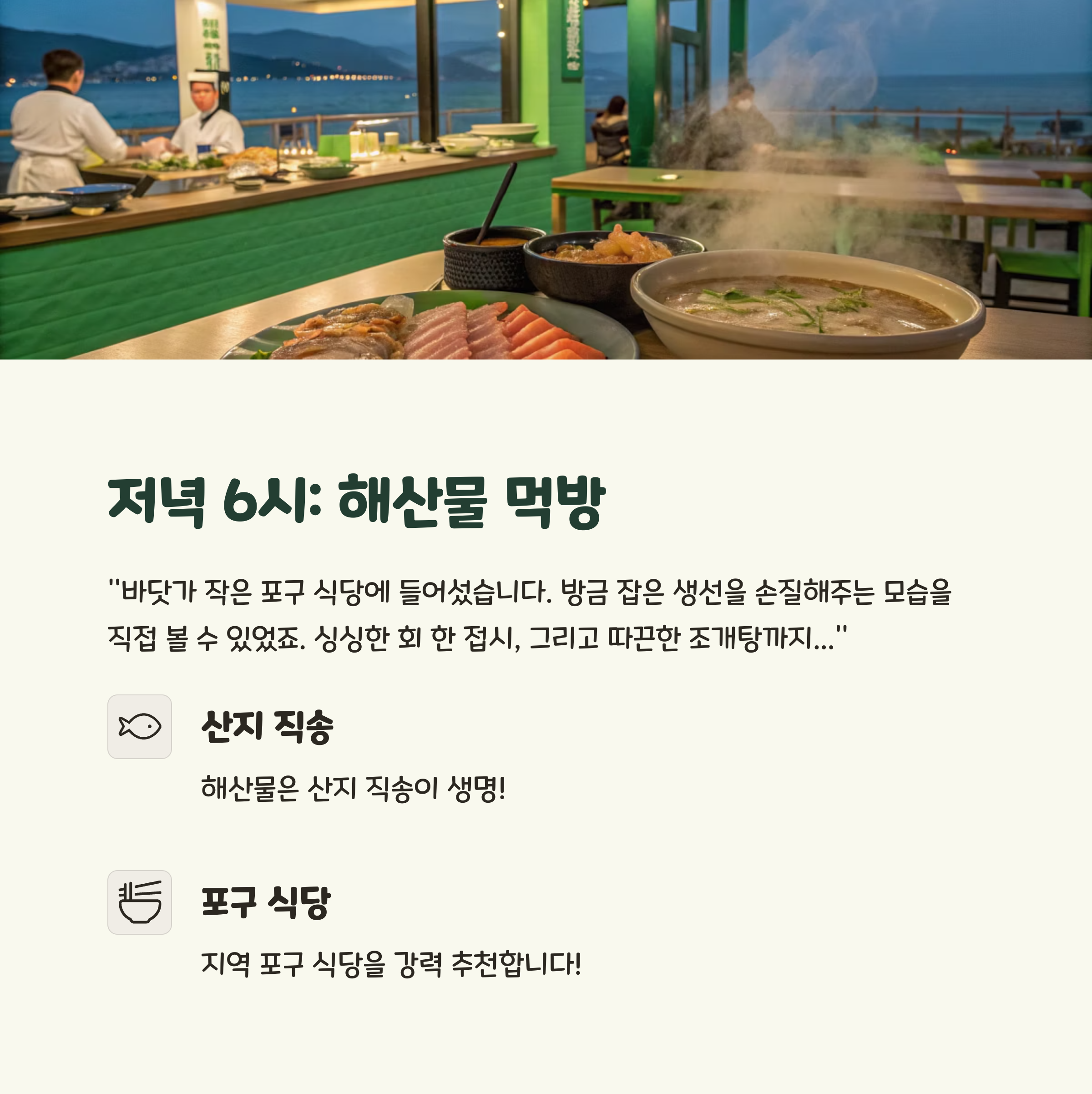 저녁 6시: 해산물 먹방 - 신선함 폭발하는 포구 식당 (스토리텔링 형식)