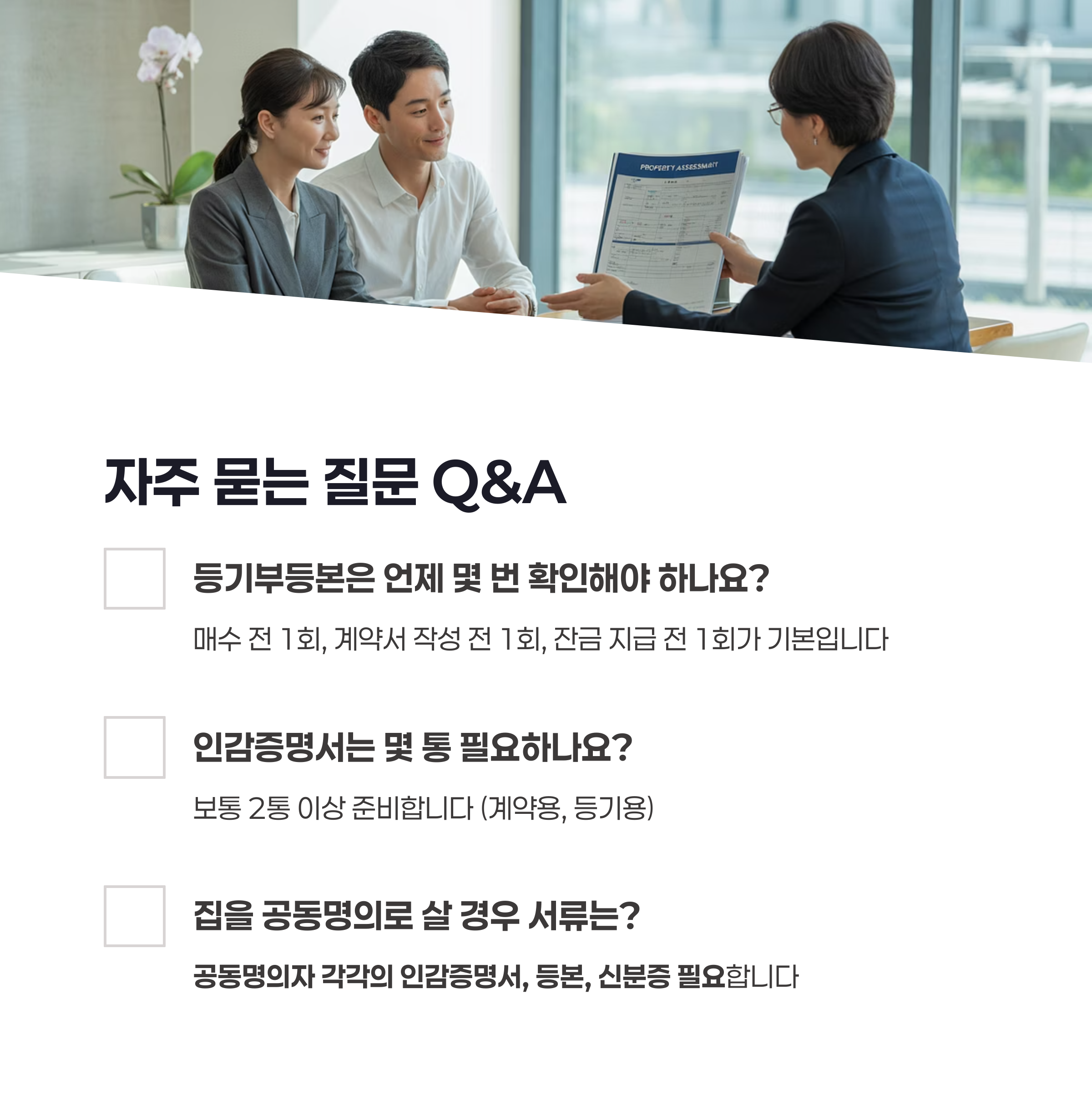 → 매수 전 1회, 계약서 작성 전 1회, 잔금 지급 전 1회가 기본입니다