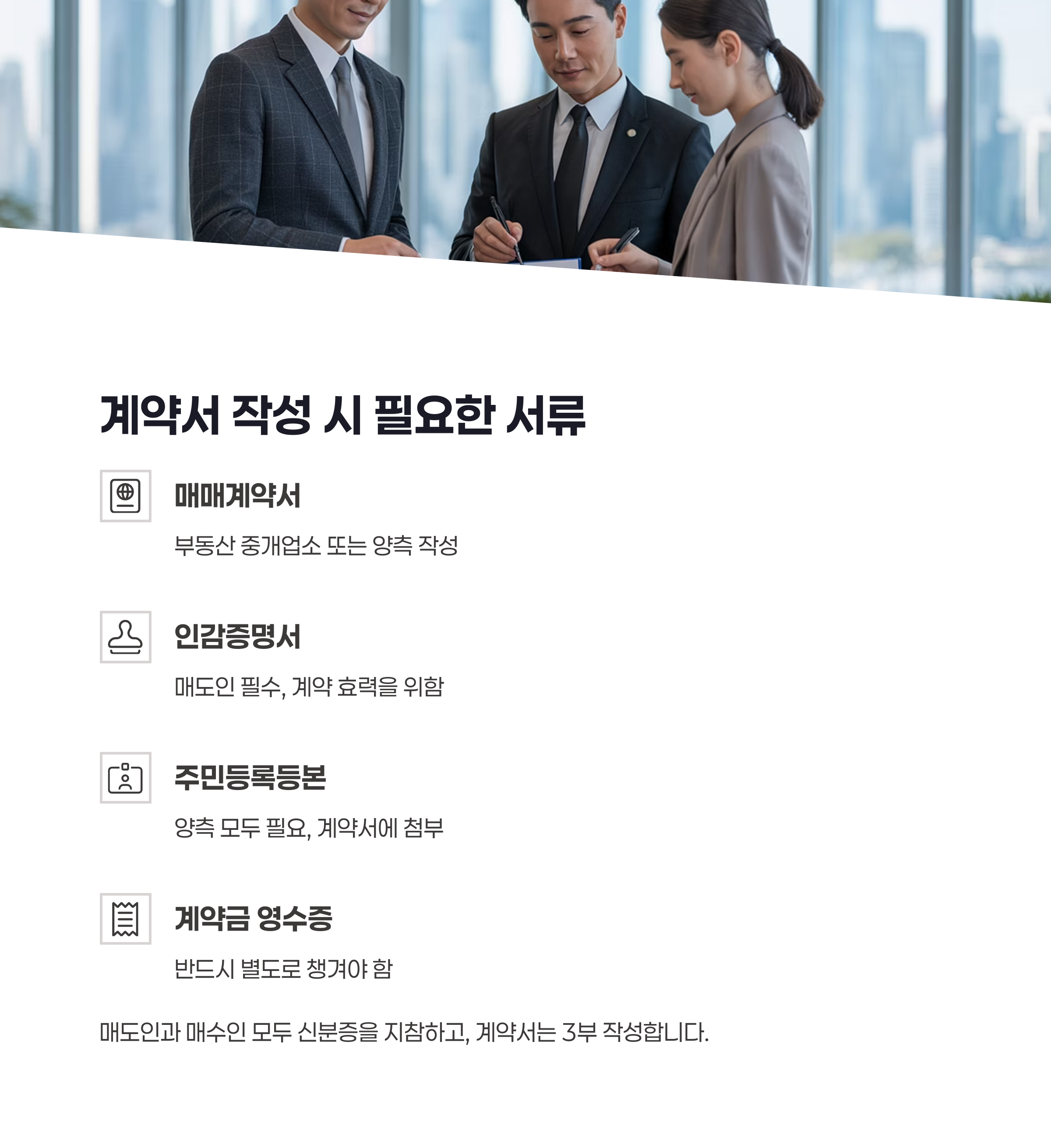 매도인과 매수인 모두 신분증을 지참하고, 계약서는 3부 작성합니다